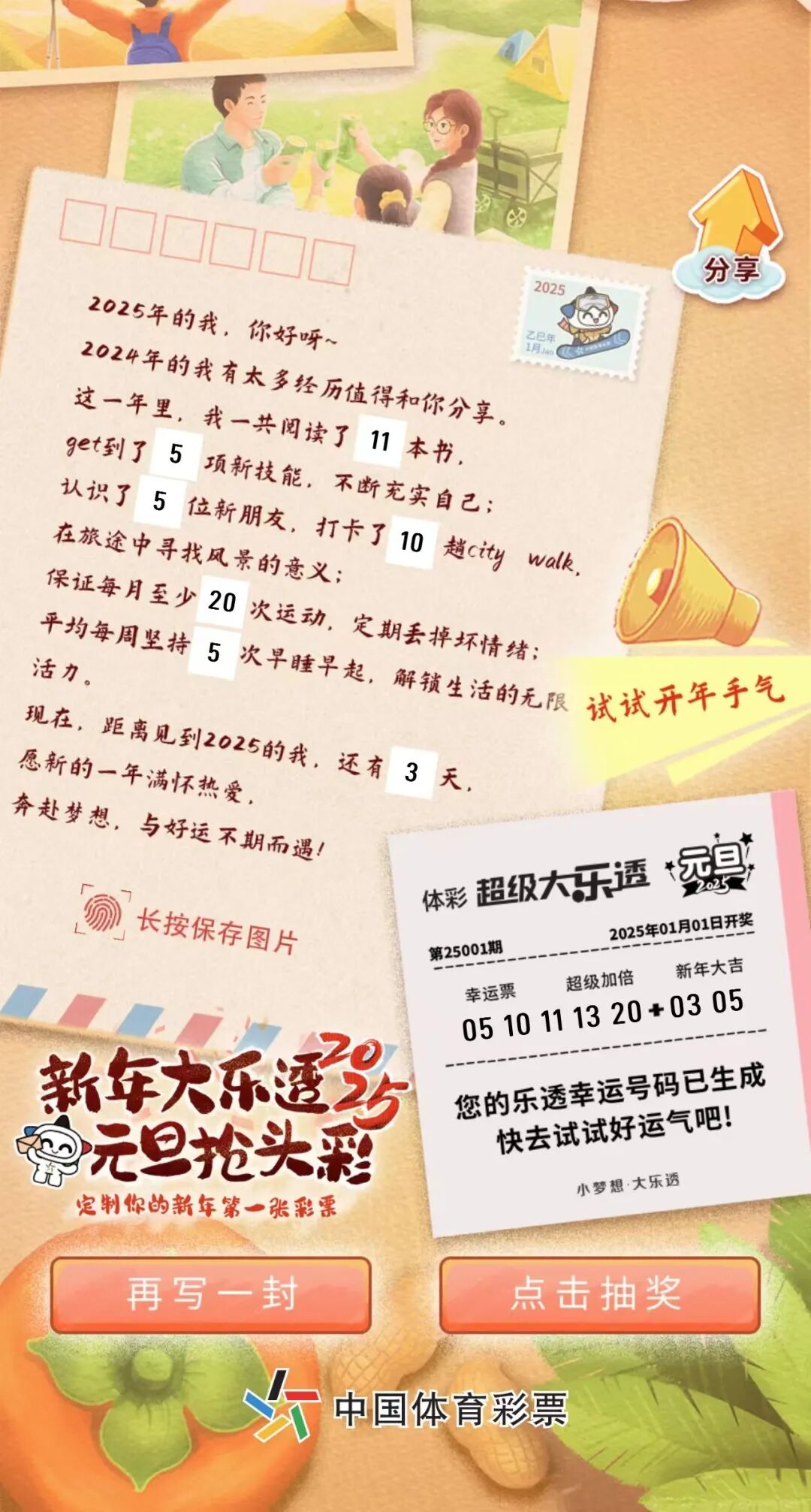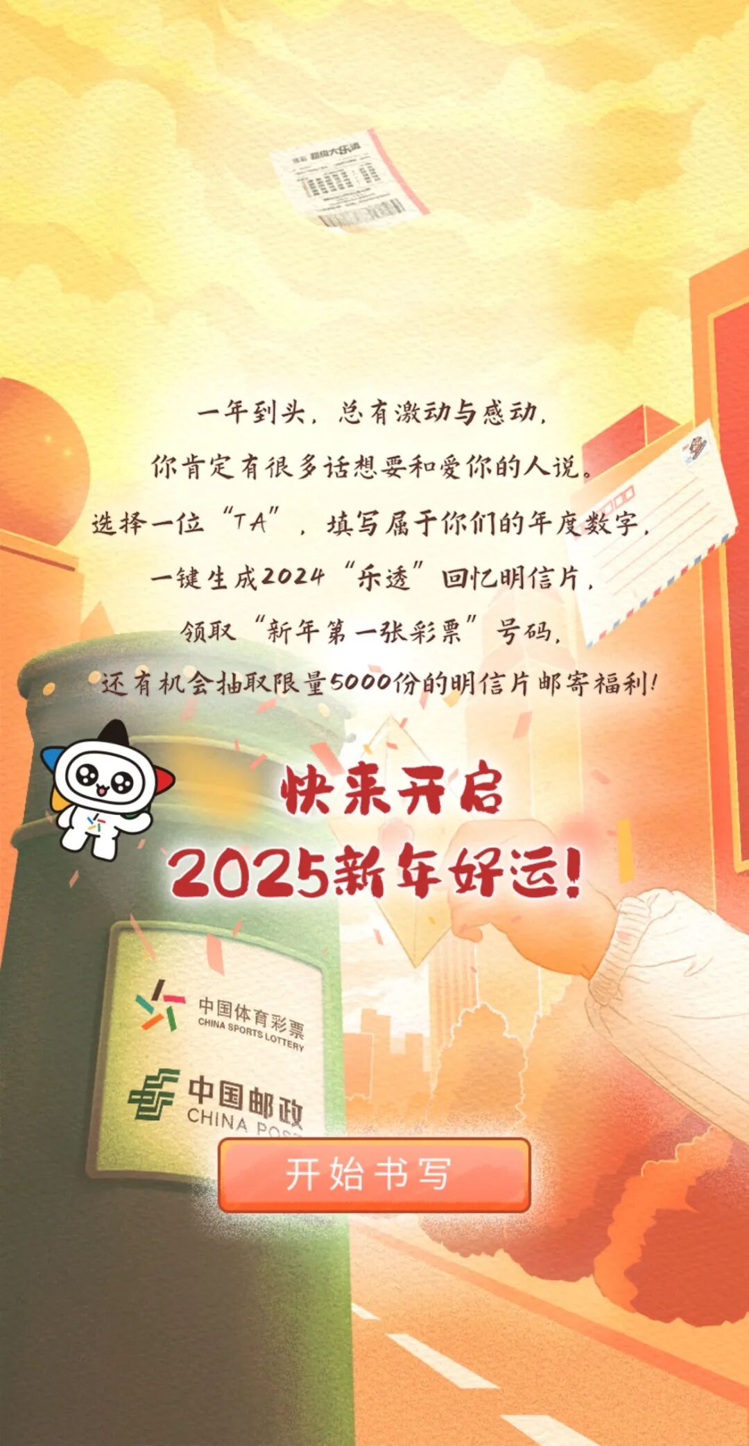 12月28日,中国体育彩票推出了“新年大乐透,元旦抢头彩——定制你的新年第一张彩票”线上互动活动。活动采用趣味互动的形式,为大众添乐趣、送祝福。用户通过填写“年度回忆”数字,生成2024回忆明信片,定制专属大乐透号码,为2025新年首次线下购彩增添好运。参与抽奖,还有机会获得限量的明信片免费邮寄福利,将新年的第一份祝福传递给自己及所爱的人。