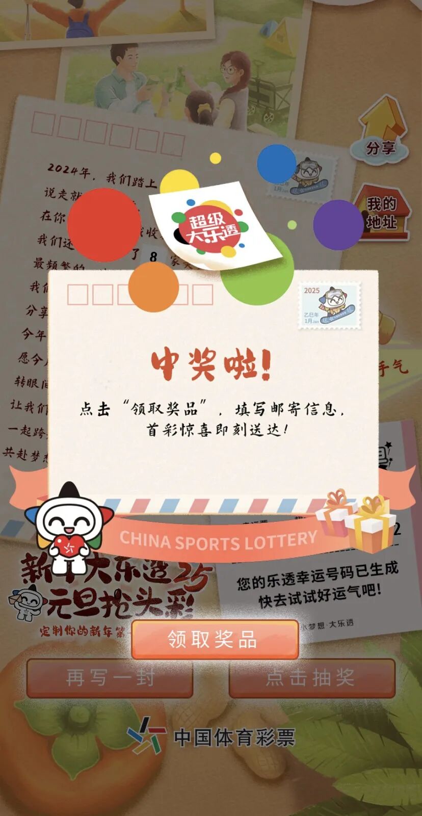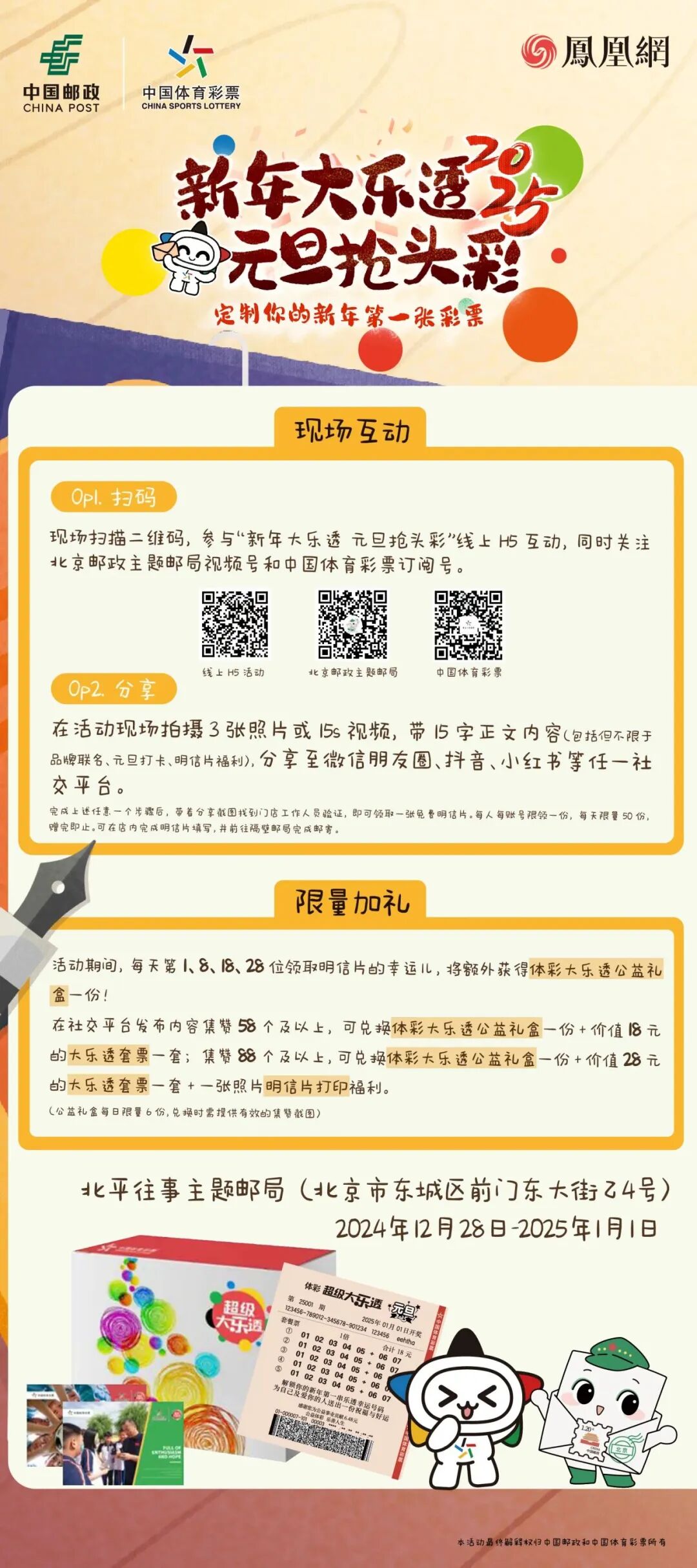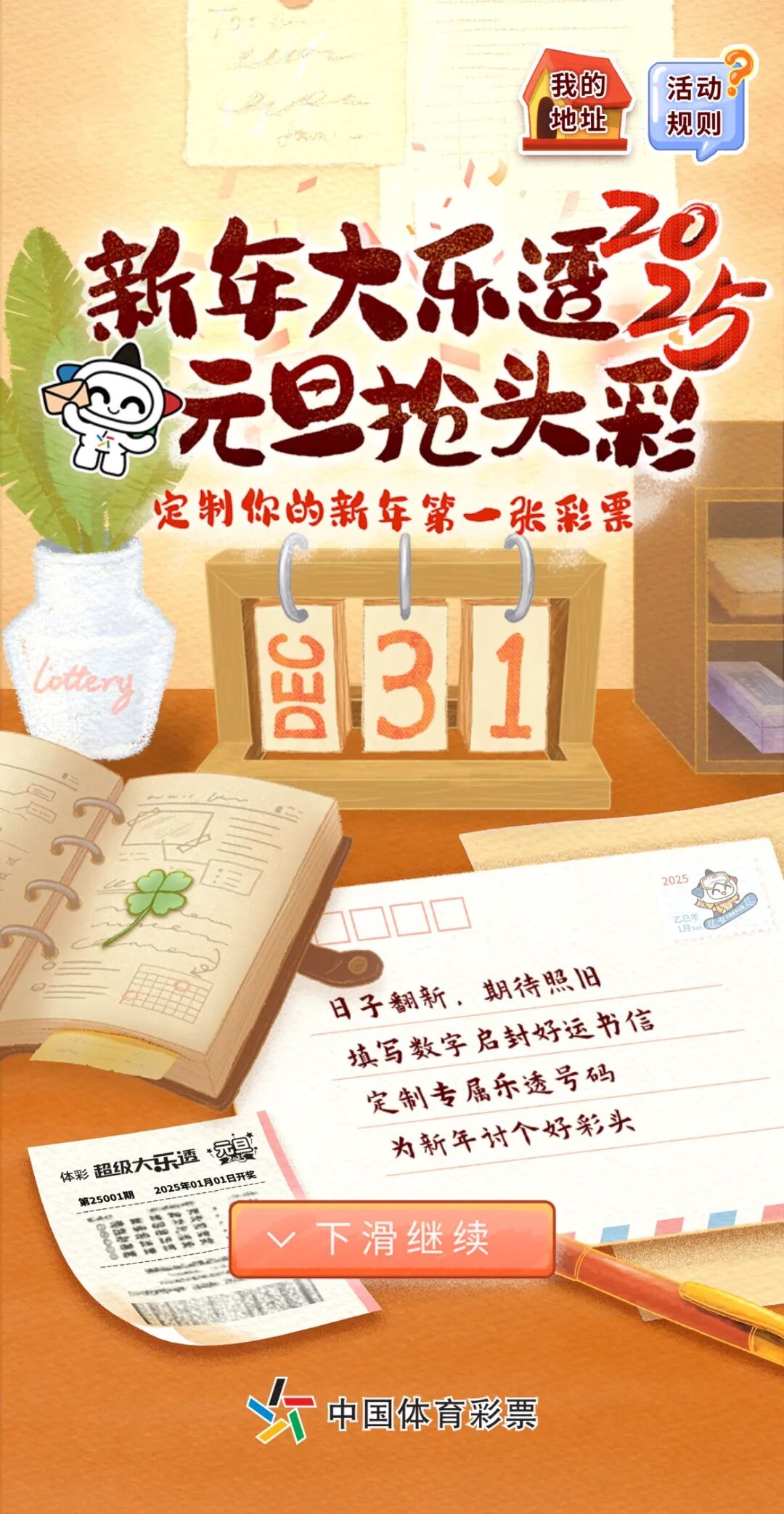 元旦之际,中国体育彩票推出“新年大乐透,元旦抢头彩”线上互动活动,并于活动期间与北京邮政联手开启“好运邮你”主题快闪店,用数字串起过去一年的点点滴滴,为2025年增添一份专属的好运与祝福。