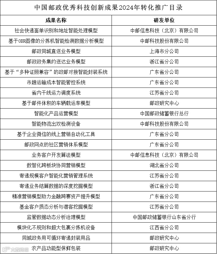 首批中国邮政优秀科技创新成果