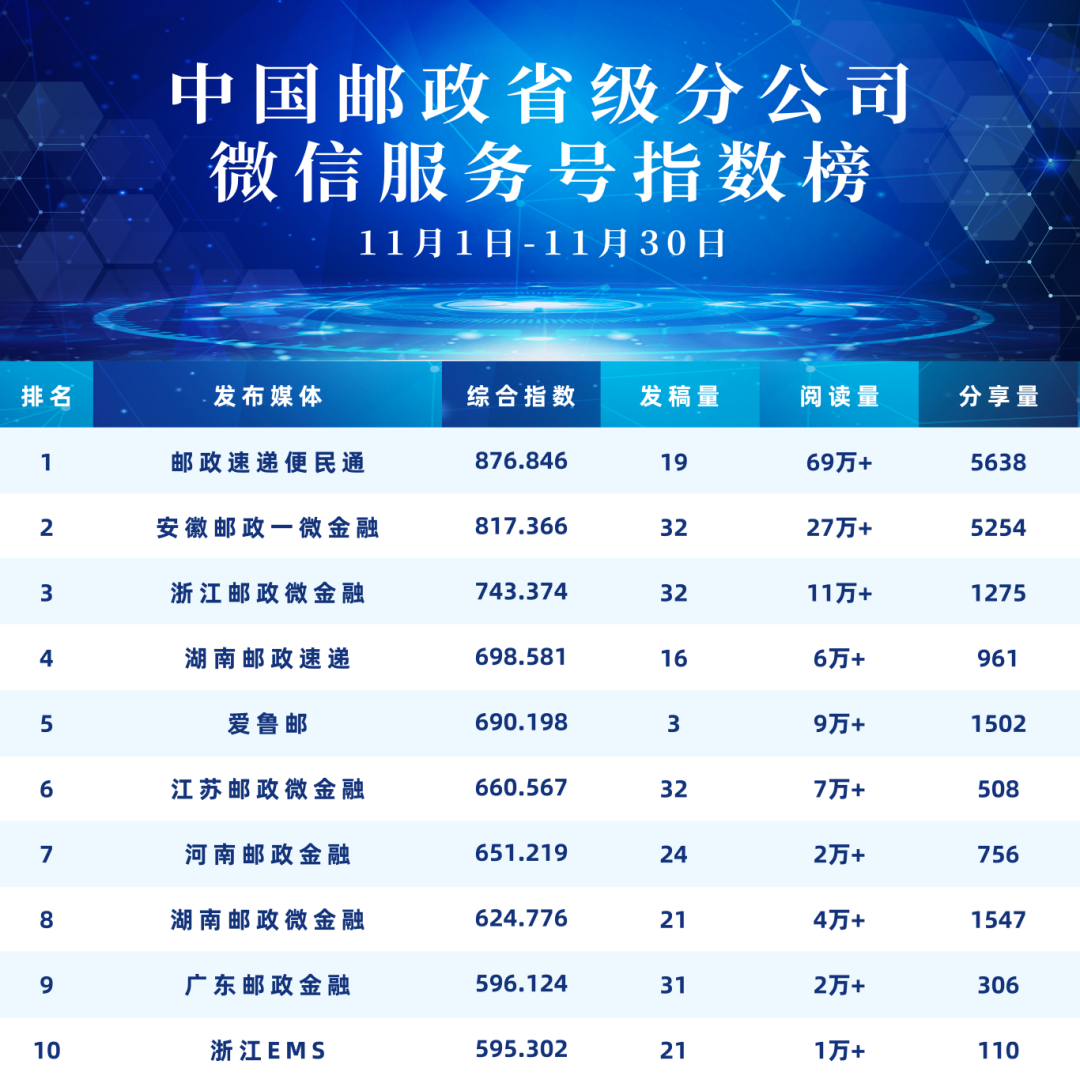 为全面评测全国邮政系统新媒体融合传播的影响力及宣传价值,集团公司综合部参照国资委新闻中心新媒体指数模型,结合邮政实际,编制《中国邮政新媒体矩阵传播情况月度评估报告》,进一步规范全国邮政系统互联网用户公众账号的运营管理,切实做到新媒体传播效果评估有依据、考核有抓手。