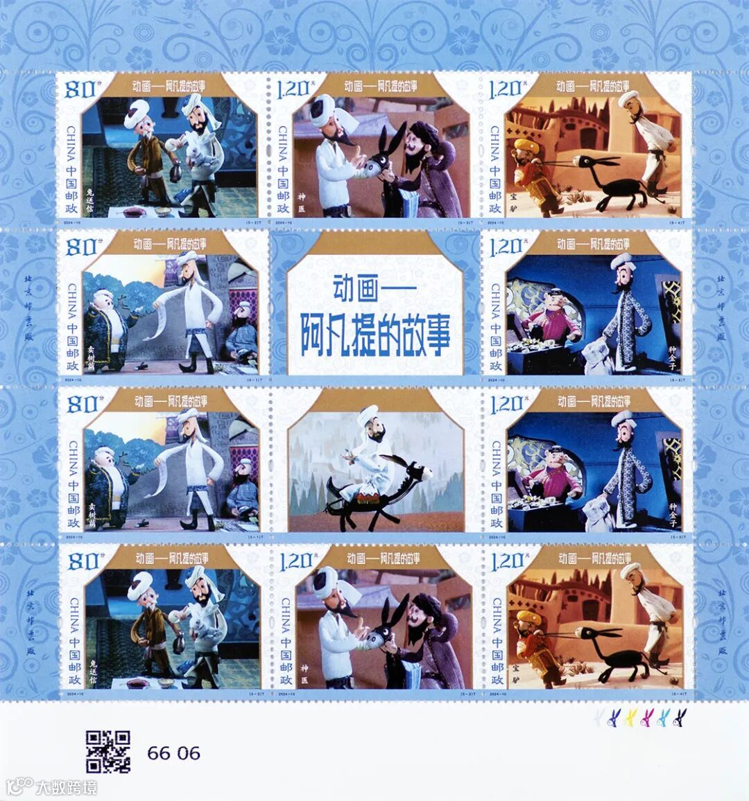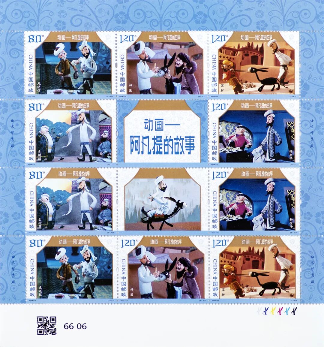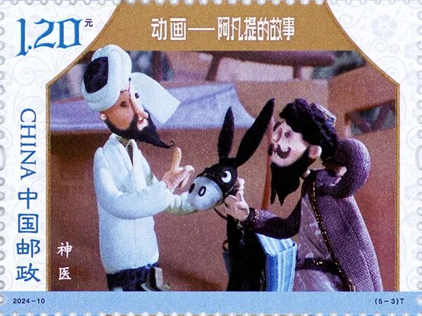 《动画——阿凡提的故事》特种邮票图案名称为卖树荫、兔送信、神医、宝驴、种金子。全套邮票面值5.20元。邮票计划发行数量为580万套。