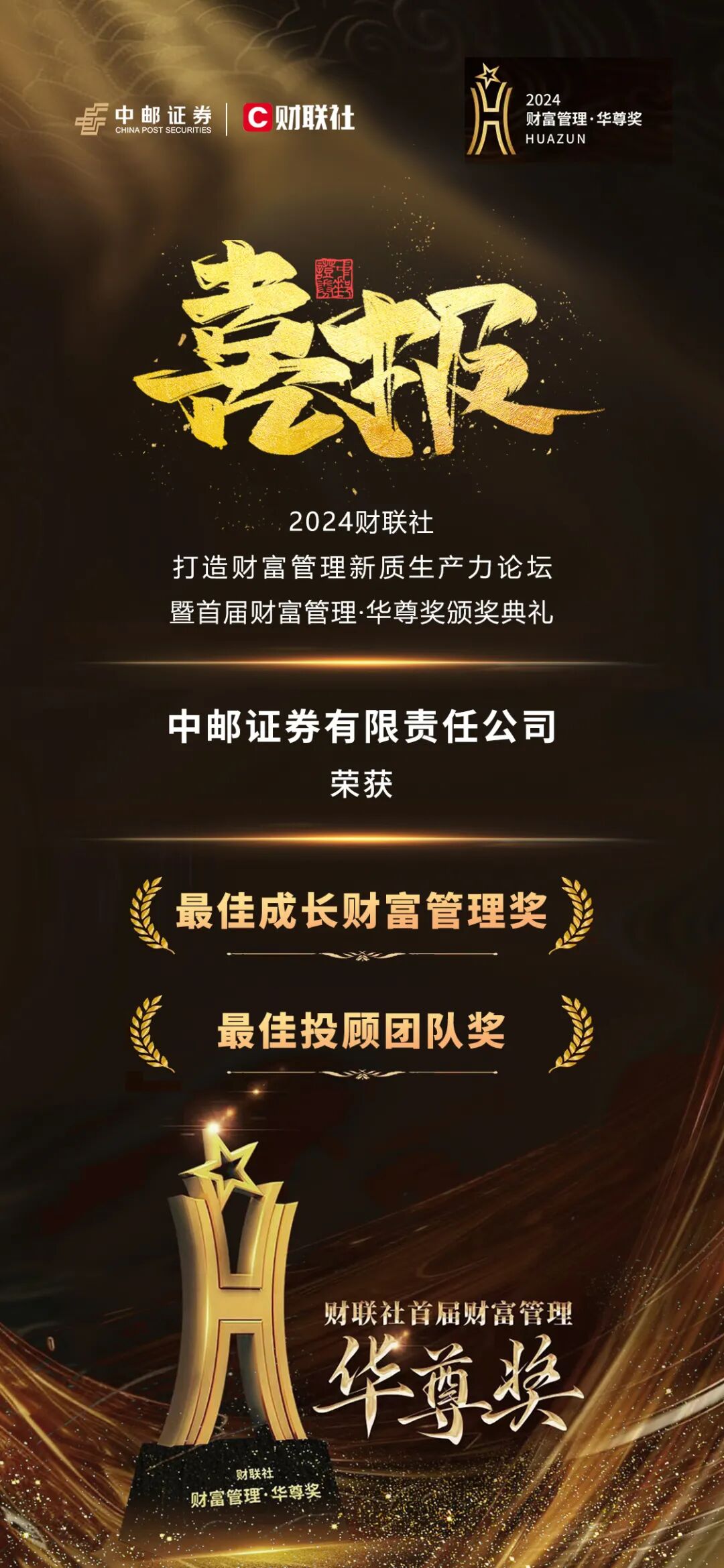 6月21日,财联社首届“财富管理·华尊奖”评选结果在江苏苏州隆重揭晓,中邮证券荣获“最佳成长财富管理奖”和“最佳投顾团队奖”双项殊荣,彰显了中邮证券财富管理业务的卓越表现,获得业界对于公司品牌影响力提升的认可。