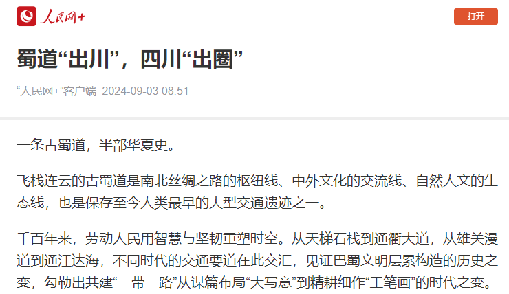 古蜀道上,翠云廊苍柏屹立千年、枝繁叶茂,注视着一条条国际航线开通,一趟趟国际班列飞驰,一个个开放平台设立,一项项投资项目落户。从设施联通、贸易畅通到文明互鉴、情谊相通,古今“蜀道”在此交叠,绘就四川道路交通与经济社会发展的新画卷,奏响共建“一带一路”海内外民相亲心相通的协奏曲。