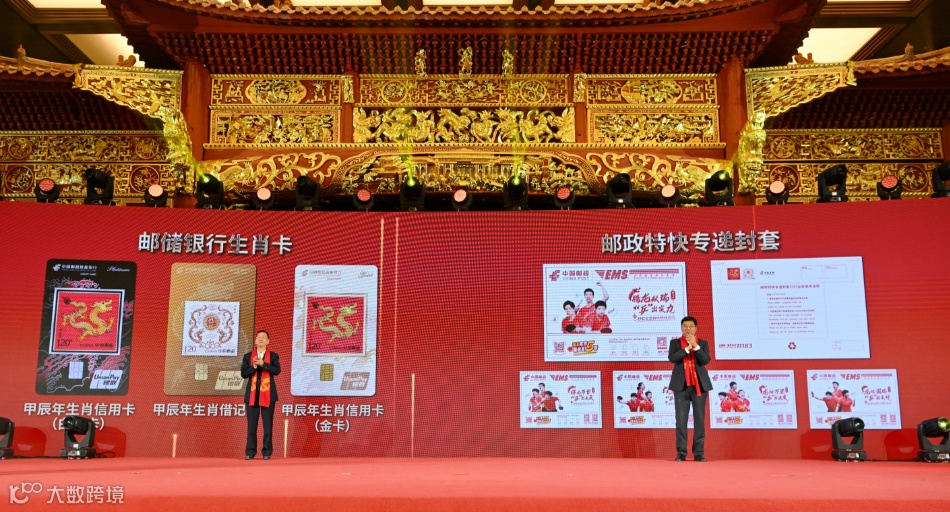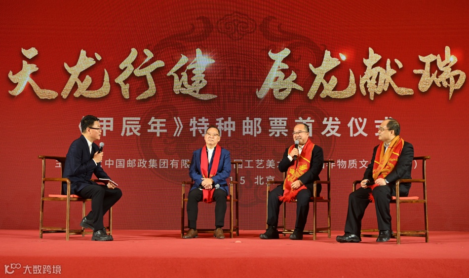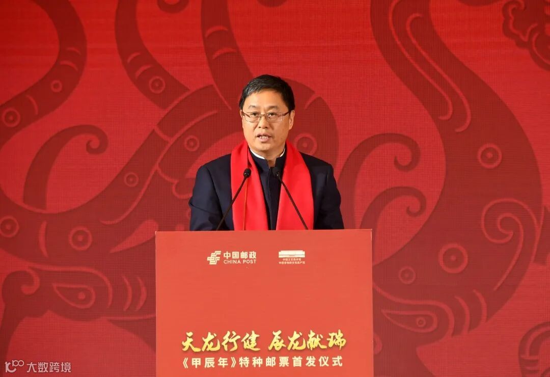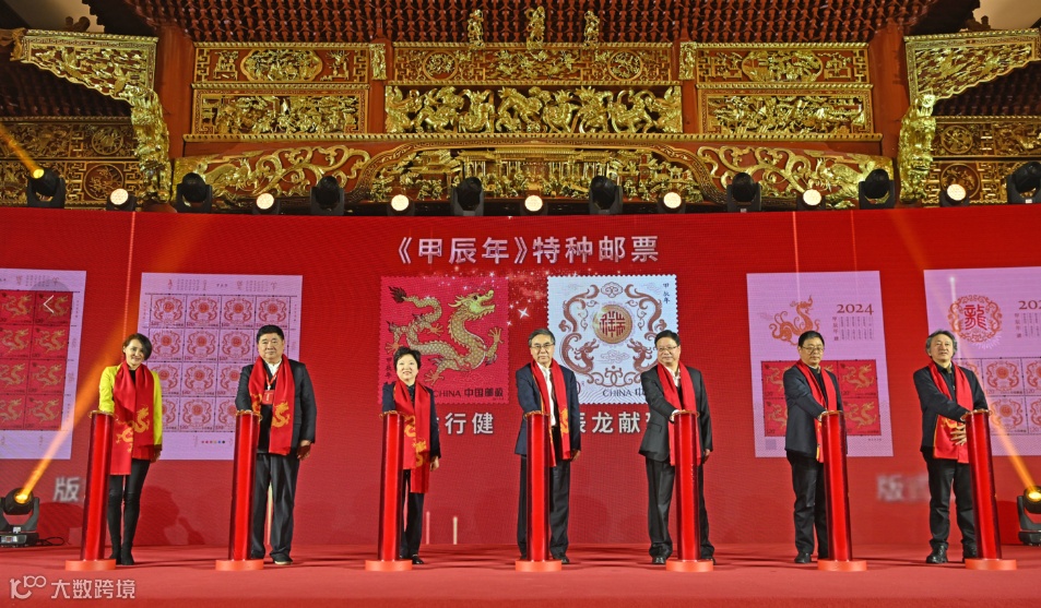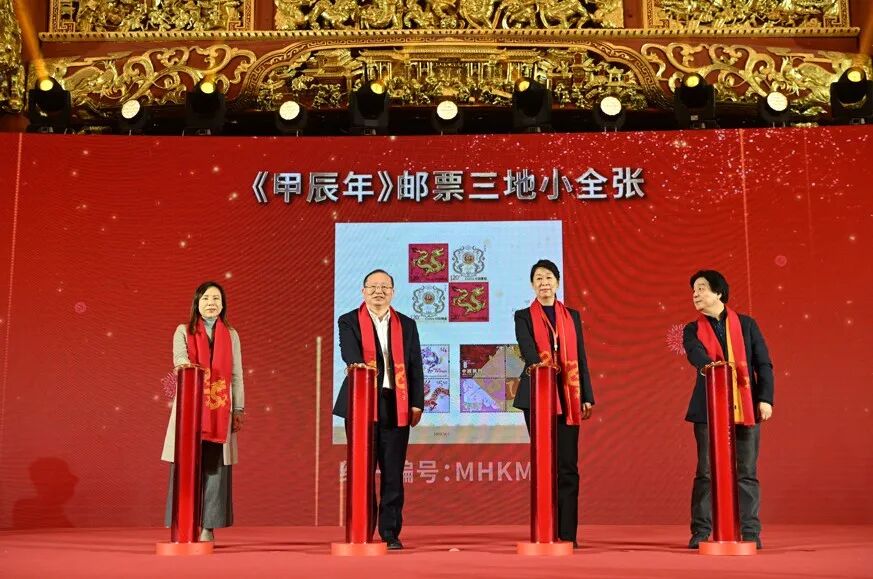 中国邮政集团有限公司携手港、澳两地邮政部门首次共同印制的生肖同题材邮票三地小全张于同日发行。中国邮政集团有限公司党组副书记、总经理郑国雨和香港邮政署署理副署长陈向黎、澳门邮电局副局长叶颂华、《甲辰年》特种邮票及三地小全张设计者王虎鸣共同为《甲辰年》邮票三地小全张发行揭幕。