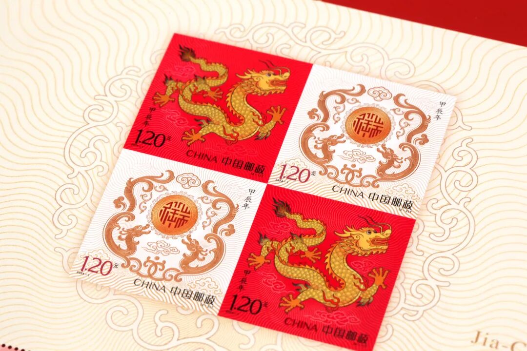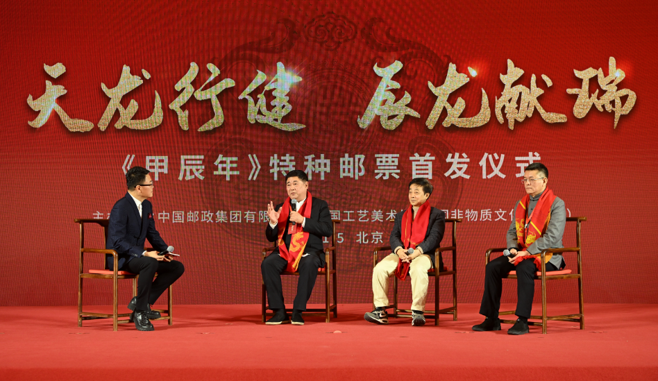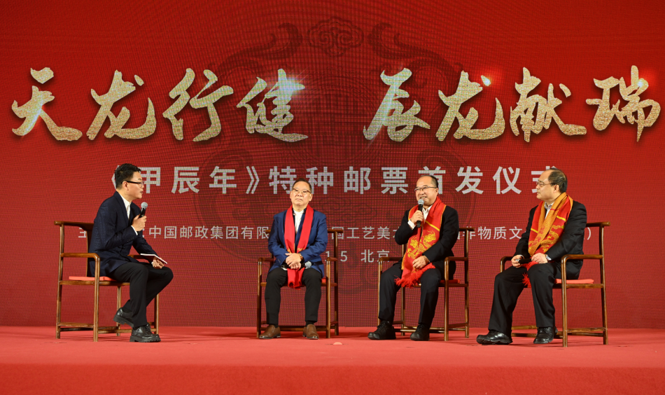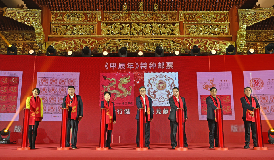 这套邮票的正式发行,为庆贺龙年新春拉开序幕。中国邮政集团有限公司党组书记、董事长刘爱力,中国艺术研究院院长、中国工艺美术馆(中国非物质文化遗产馆)负责人周庆富,中国美术家协会分党组书记、驻会副主席马锋辉在仪式上致辞,并与国家邮政局副局长戴应军、中国宋庆龄基金会党组书记沈蓓莉、中国文物学会会长单霁翔、奥运冠军高敏等共同为《甲辰年》特种邮票揭幕。刘爱力代表中国邮政向中国工艺美术馆(中国非物质文化遗产馆)赠送编号为01号的《甲辰年》特种邮票大版票作为捐赠收藏。