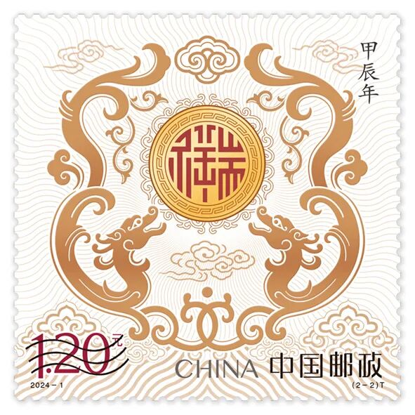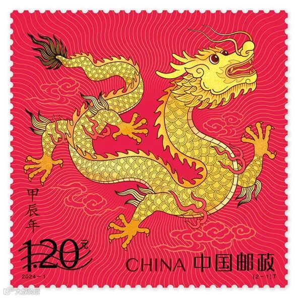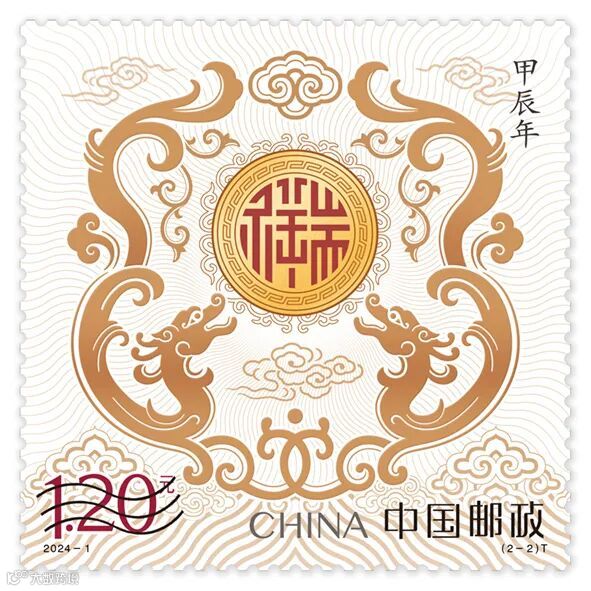 《甲辰年》特种邮票1套2枚,邮票图案名称分别为天龙行健、辰龙献瑞。图案汲取中国历代经典龙形象中的文化基因,结合生肖文化特征和邮票艺术特点,用平面装饰的设计语言诠释出新的时代、新的历史时期的龙形象,彰显出新时代自信、自强的文化底蕴。画面简洁明快,色彩喜庆吉祥,寓意祥瑞美好。