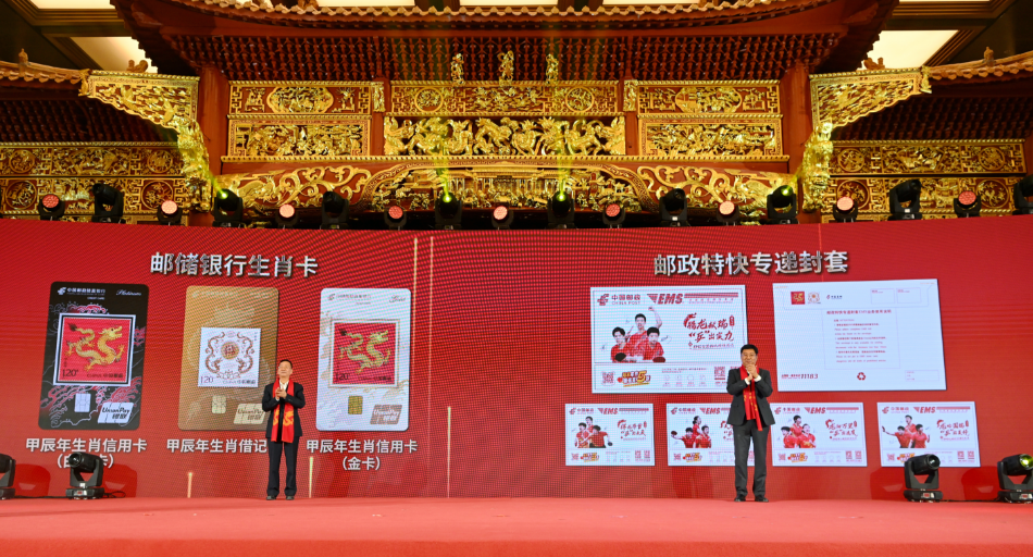 中国邮政集团有限公司副总经理温少祺、中国工艺美术馆(中国非物质文化遗产馆)副馆长魏大威为邮储银行生肖卡、邮政特快专递封套揭幕。