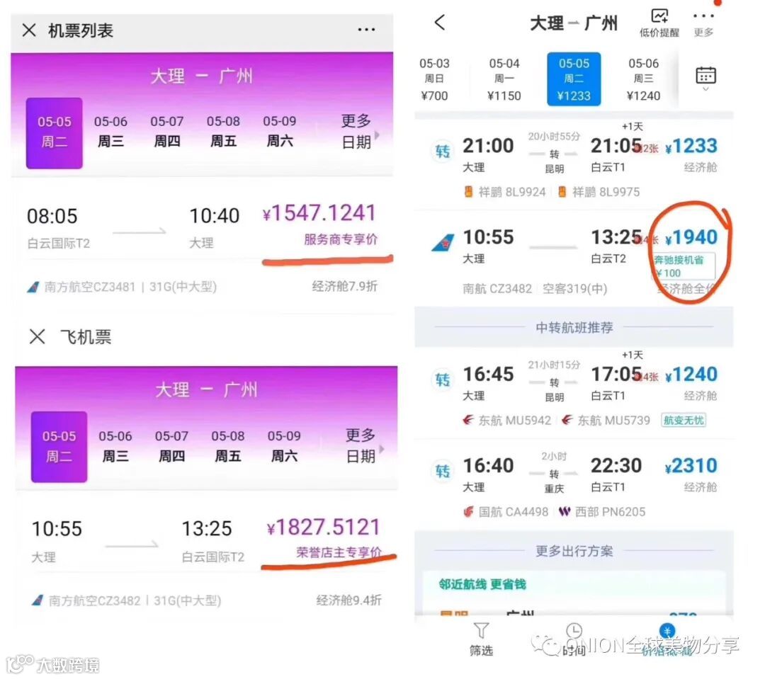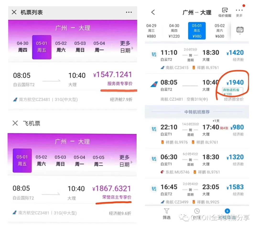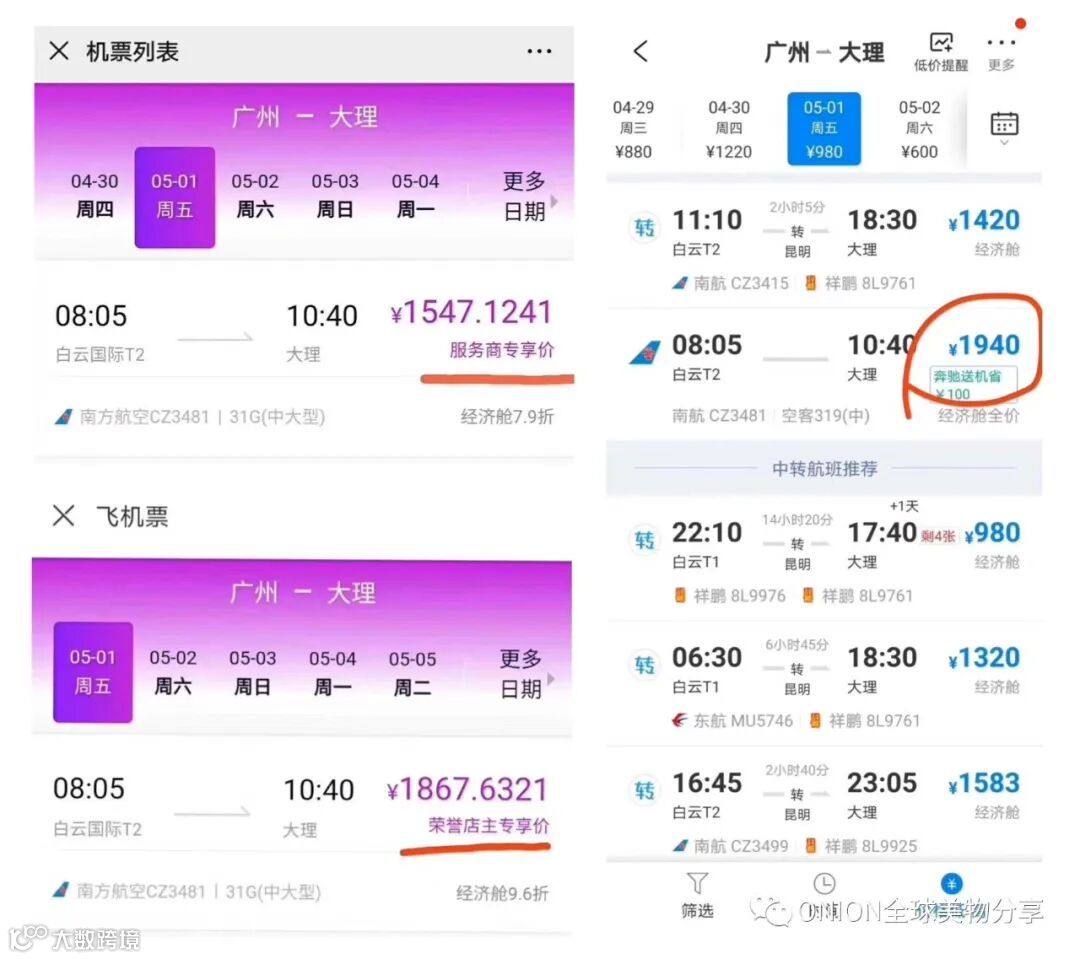 店主价比携程便宜¥100多,服务商价格再比店主便宜¥300多,也就是说如果你是服务商,往返大理的机票钱就能比以往在携程买,便宜¥800多!
