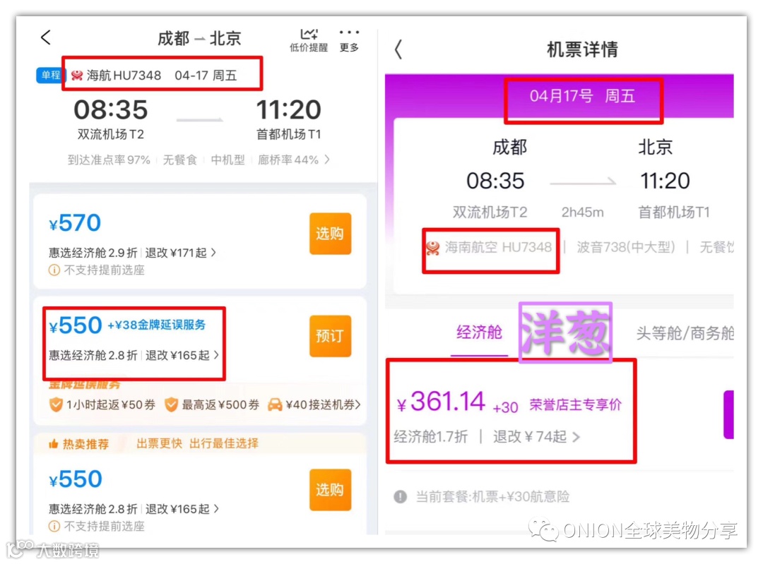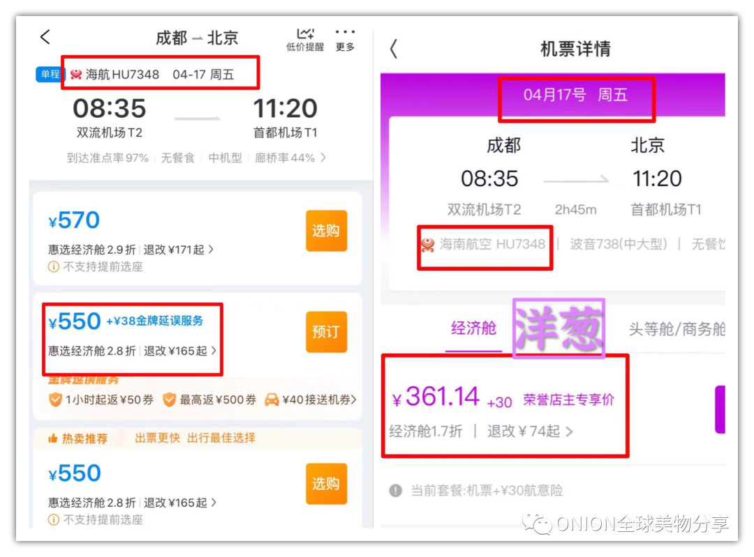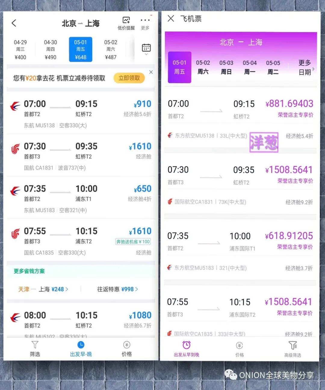 那么洋葱的价格优势如何呢,小编当然第一时间就会随手来对比一下机票价格喽