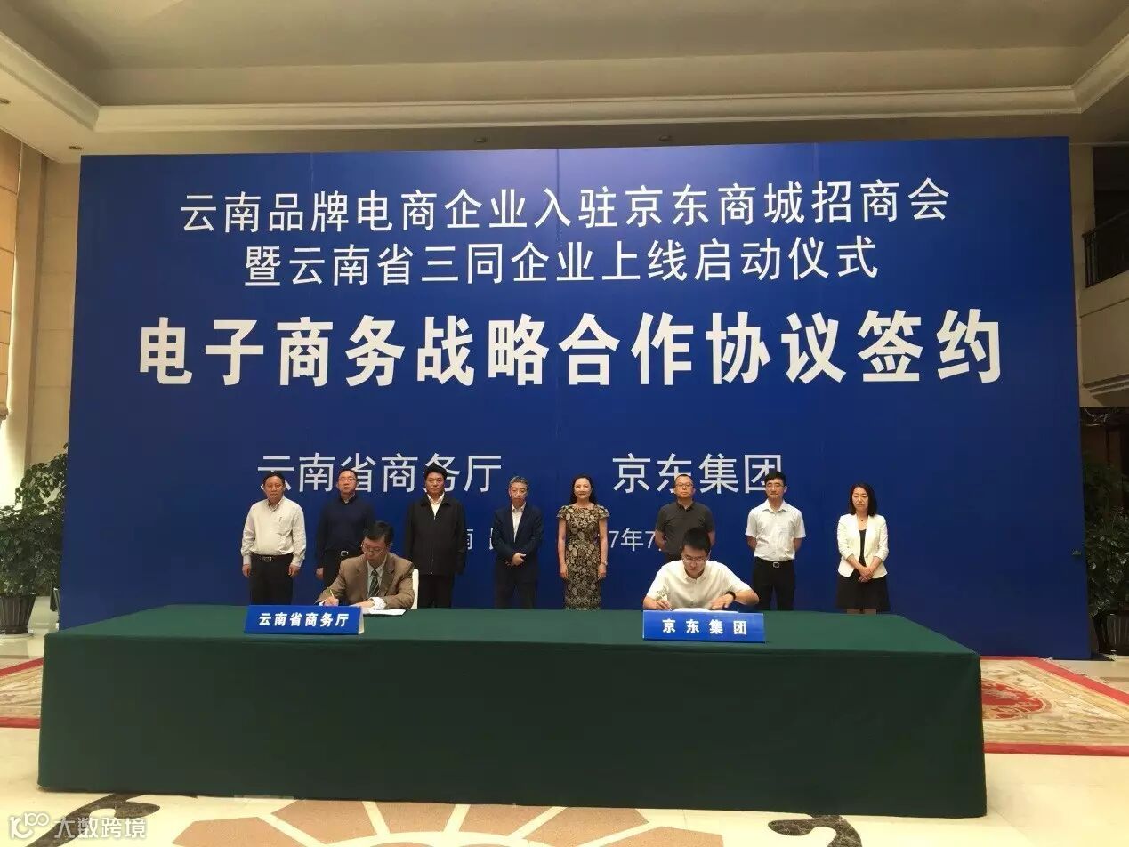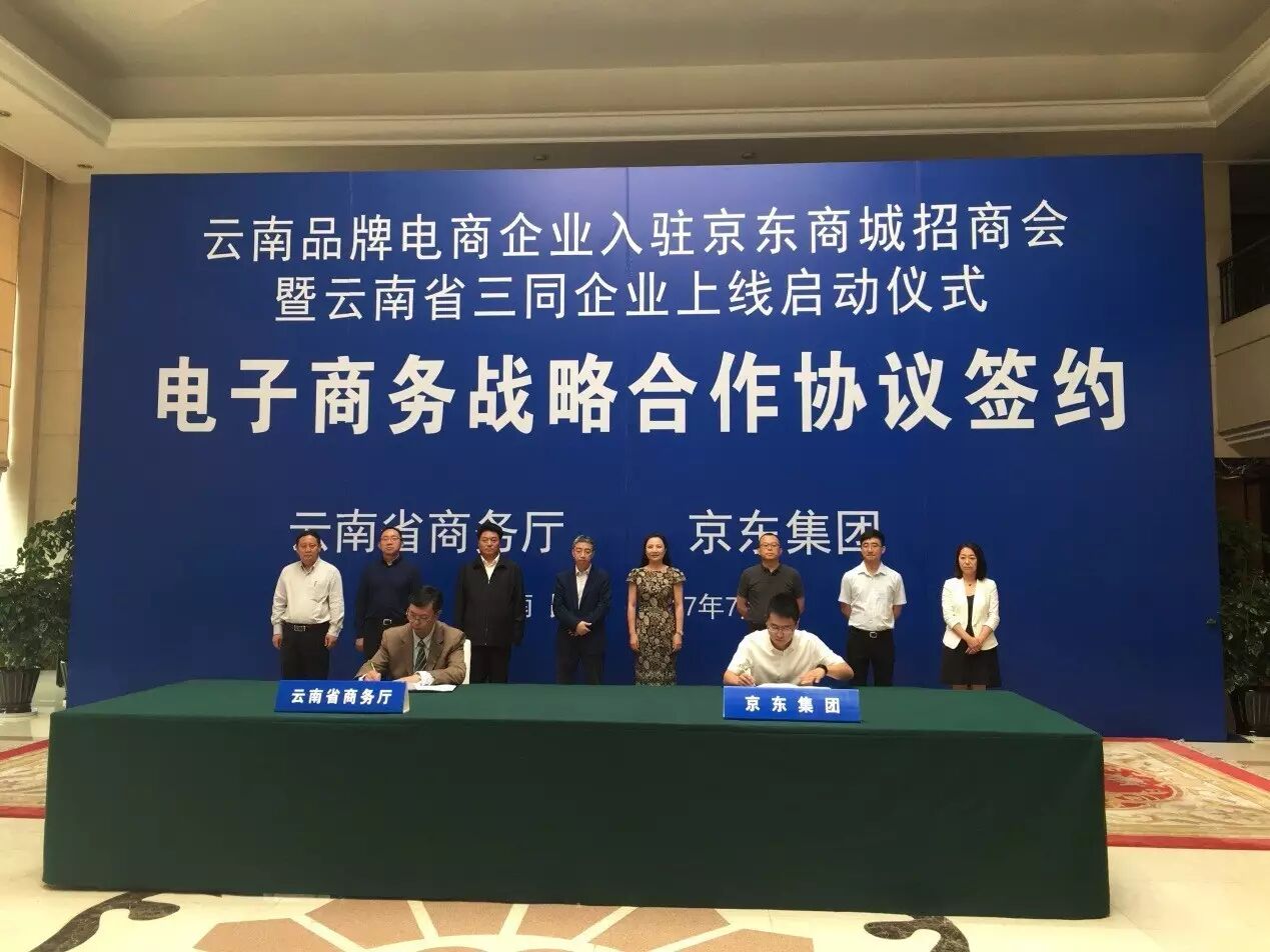 为贯彻落实《国务院关于大力发展电子商务加快培育经济新动力的意见》,帮助更多优质的云南商家和品牌入驻京东,助推云南高原特色产品“走出去”,用“互联网+”的方式助力云南开展扶贫攻坚工作,7月11日,云南省商务厅与京东签订了《电子商务战略合作框架协议》。