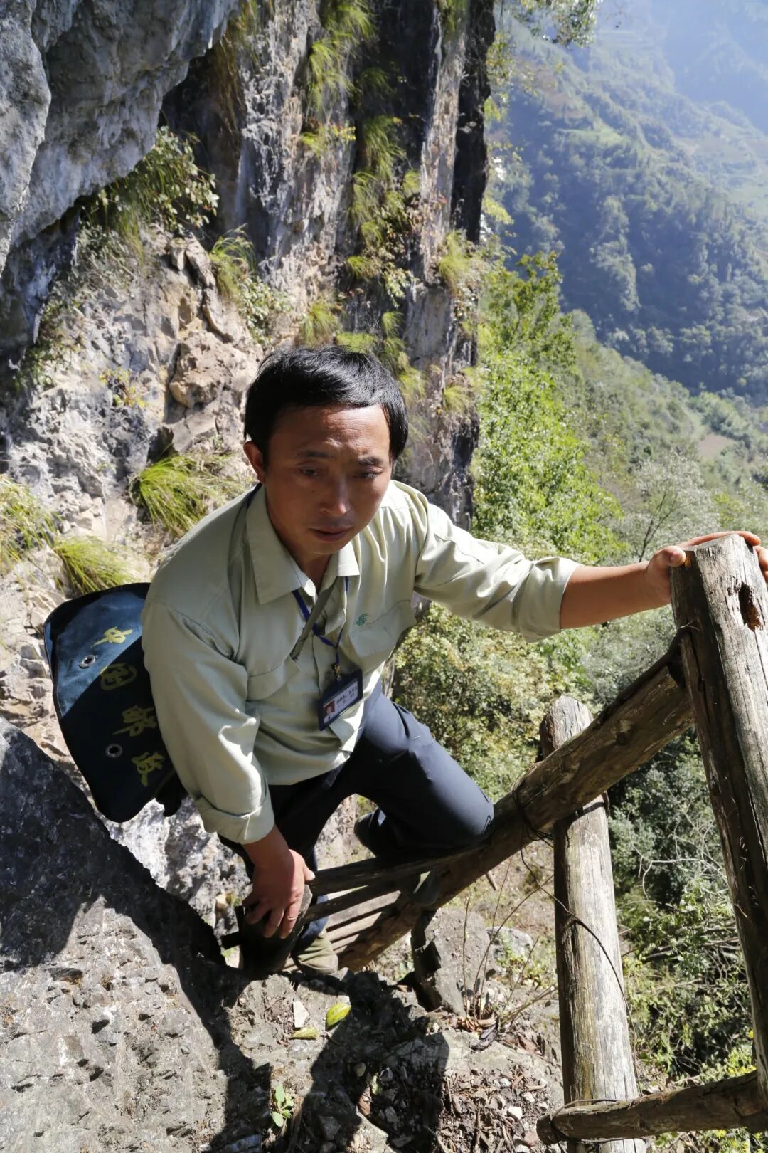 杜登文跑的邮路是全县最艰苦的路段。每跑一班要爬登两次20多米高的“天梯”,走过两座100多米长的吊桥。他拖着邮袋一步一步往前爬,每次走完这段路程都要吓出一身冷汗,全身湿透。