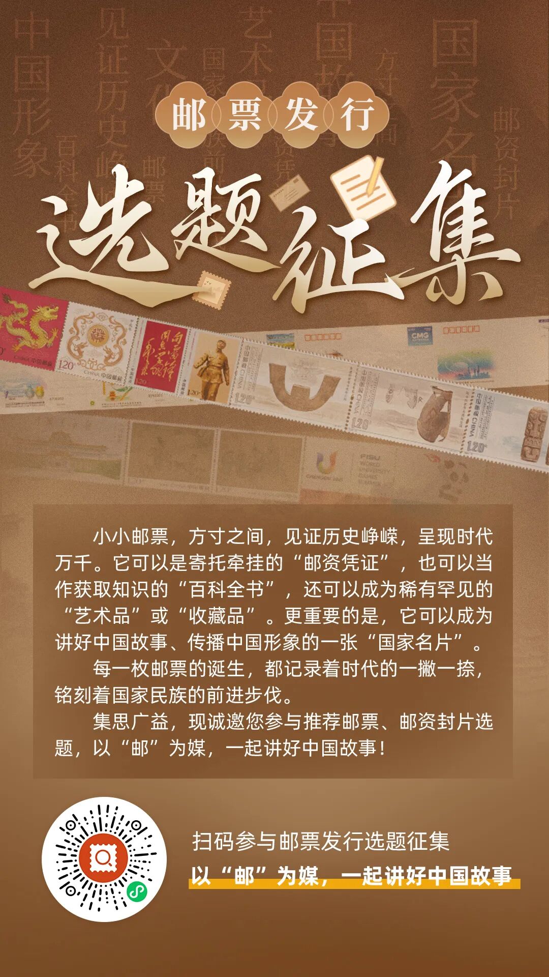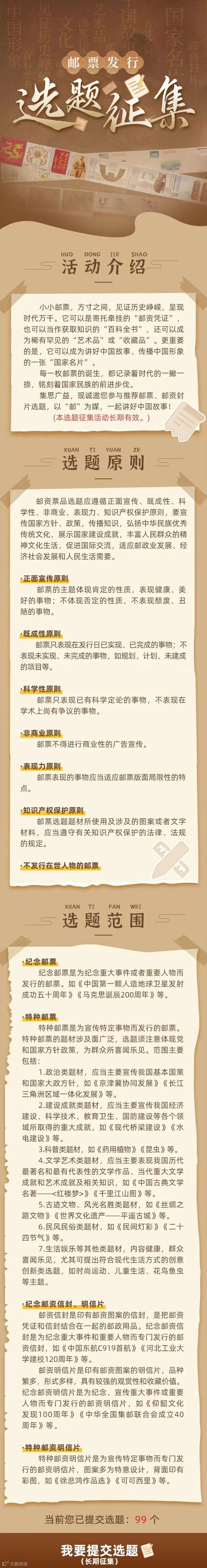 中国邮政邮票选题征集入口已经打开,你的选题,也许是关于祖国的壮丽山河,展现大自然的鬼斧神工;也许是关于民族文化的瑰宝,继承着古老而深厚的传统;也许是关于现代科技的飞速发展,展现人类智慧的结晶。无论你的选题是什么,都将被用心倾听,审慎评议。你的选题一旦被采纳,你的智慧与创意,将化为一枚枚精美的邮票,传递给更多的集邮爱好者,让更多的人感受到邮票文化的魅力。
