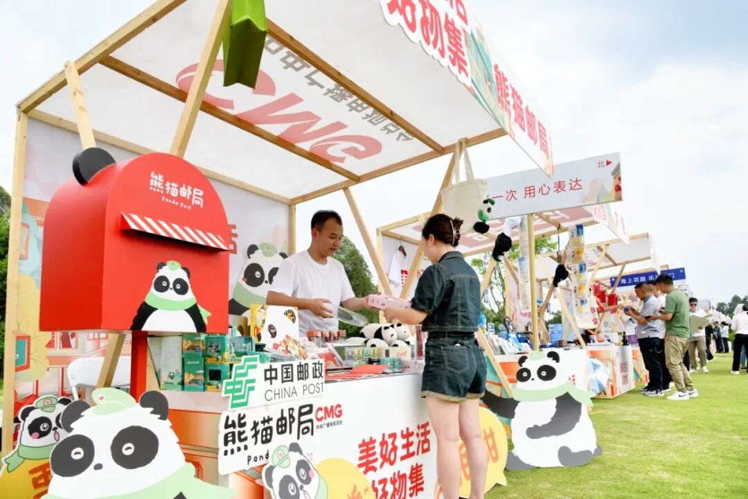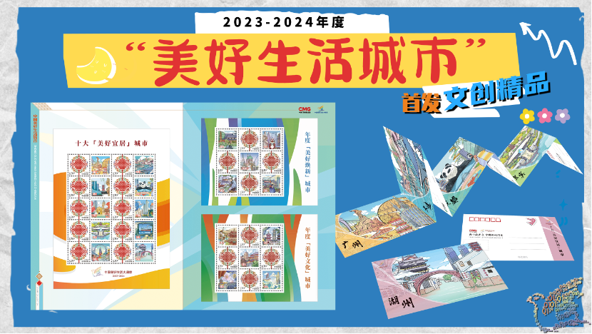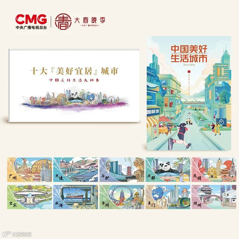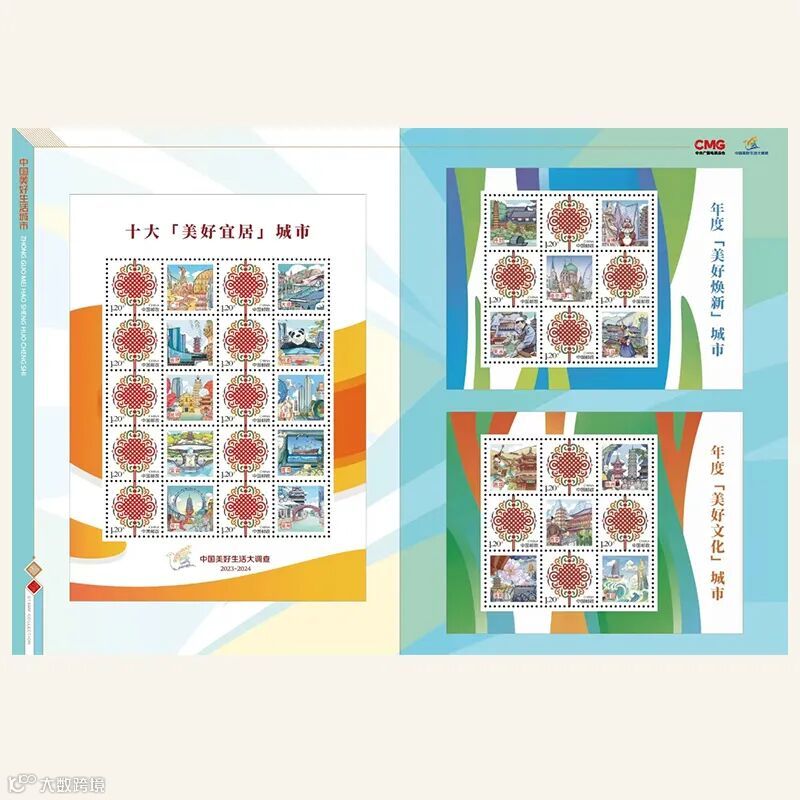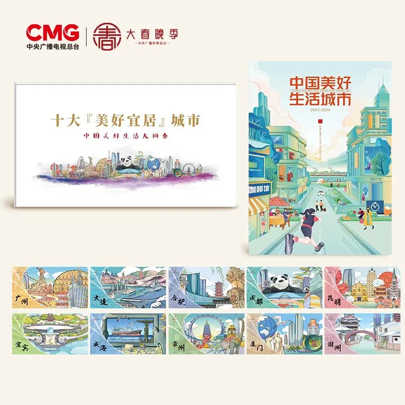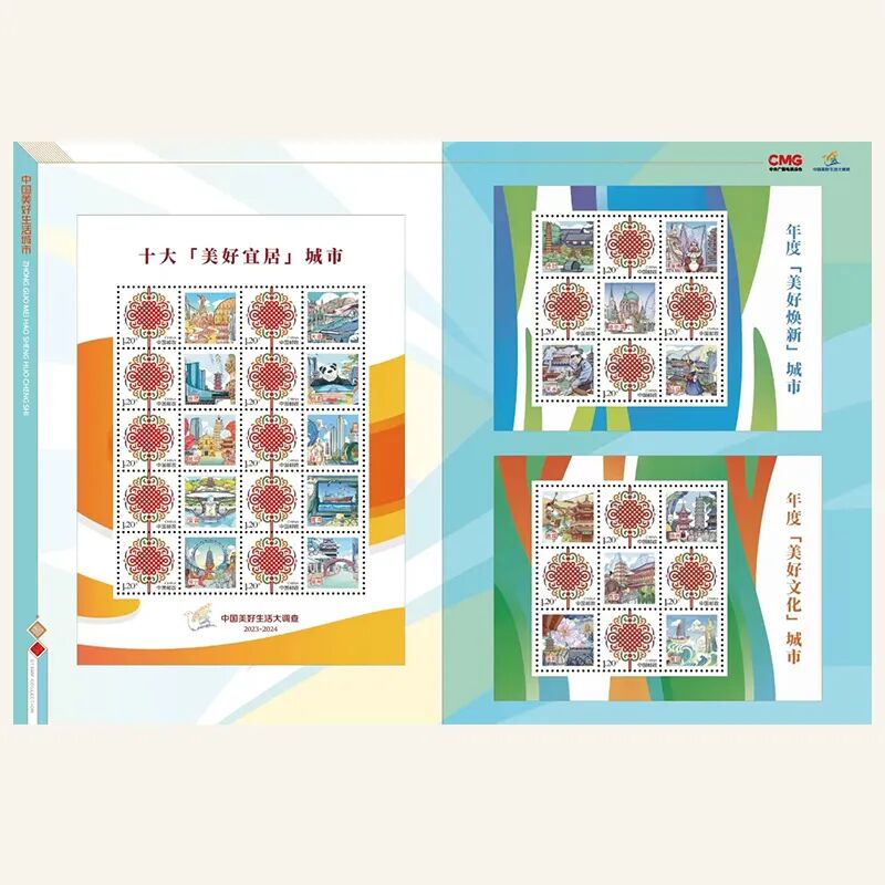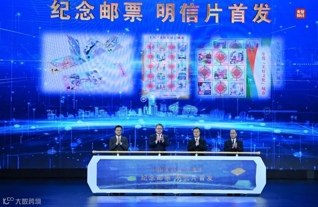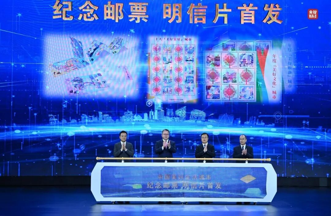 中央广播电视总台编务会议成员彭健明,成都市委常委、宣传部部长辜学斌,中国邮政集团有限公司邮政业务部总经理杜卫红,中央广播电视总台财经节目中心主任蔡俊,共同为限量版美好生活城市纪念邮票和连体明信片揭幕。
