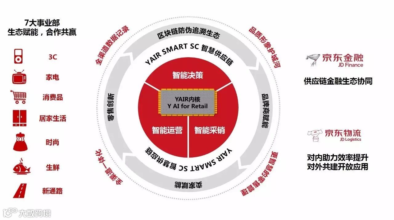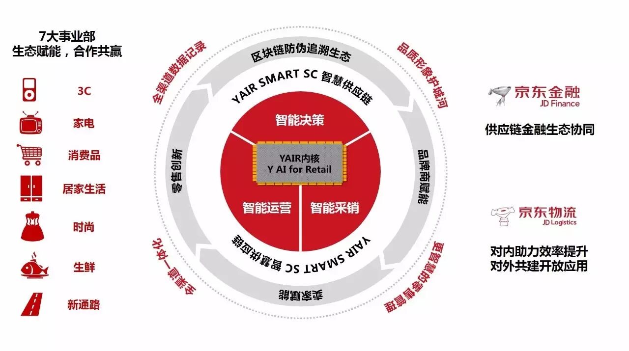 Y事业部正依托YAIR零售人工智能平台,持续提升技术对于京东内部业务的支持,支撑京东零售和供应链管理的智能决策、智能采销和智能运营。基于京东内部智能化系统应用的验证和积累,逐步形成YAIR SMART SC京东智慧供应链解决方案——这是一个集成了京东零售、供应链管理经验、京东大数据积累、京东人工智能算法能力的综合解决方案。京东智慧供应链解决方案将以组件化的方式面向品牌商和零售商家开放,在开放的过程中,同时提供区块链防伪追溯的解决方案,并针对相关数据和对外开放组件的应用反馈进行分析,优化组件应用,驱动全渠道零售的创新。