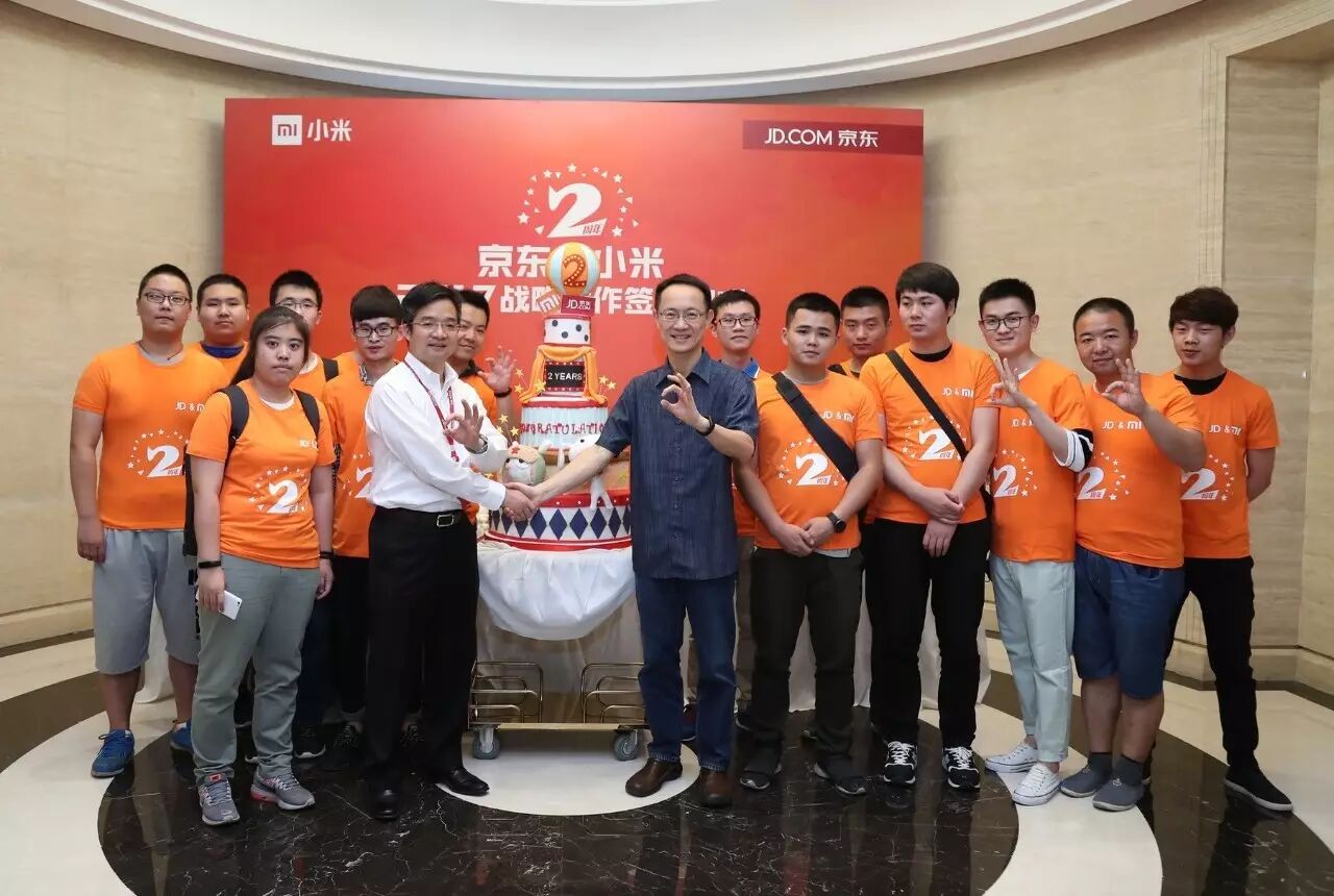 谈及京东小米的合作,可追溯至两年前。2015年5月28日,小米公司与京东商城联合宣布,小米的京东官方旗舰店正式上线运营。转眼两家牵手即将两年,值此之际,2017年5月18日,小米公司联合创始人、总裁林斌来到京东总部,与京东集团副总裁、3C事业部总裁胡胜利共同签署战略合作协议,商议双方接下来的合作目标,力争在未来一年销量提速,联手冲刺从合作初至2017年底累计卖出1亿件小米商品的销售成绩!签约现场,多名米粉惊喜现身,与京东、小米共庆小米京东官方旗舰店2周年!