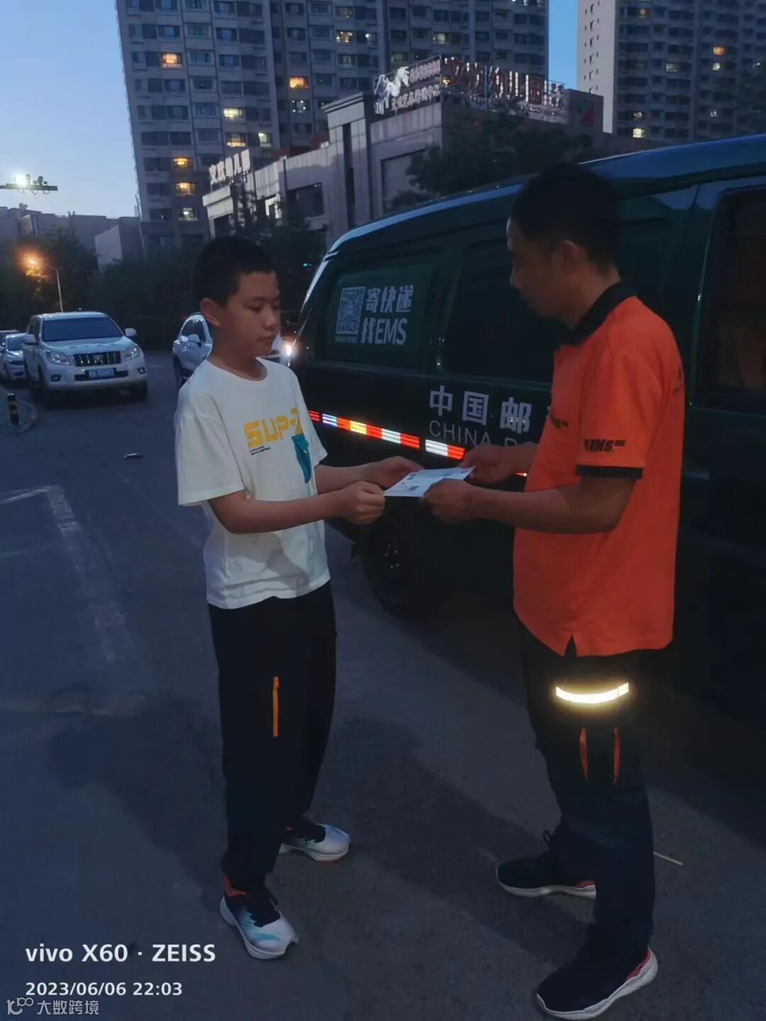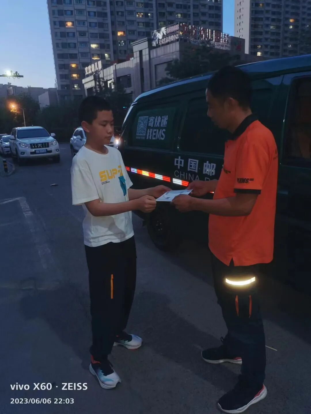 21时许,邱致东将邮件分别交到乌鲁木齐市分公司会展中心营业部揽投员金志敏和南湖西路揽投部揽投员李春荣手中。接到这个紧急任务,两名揽投员二话不说,立刻发车为考生极速投递。