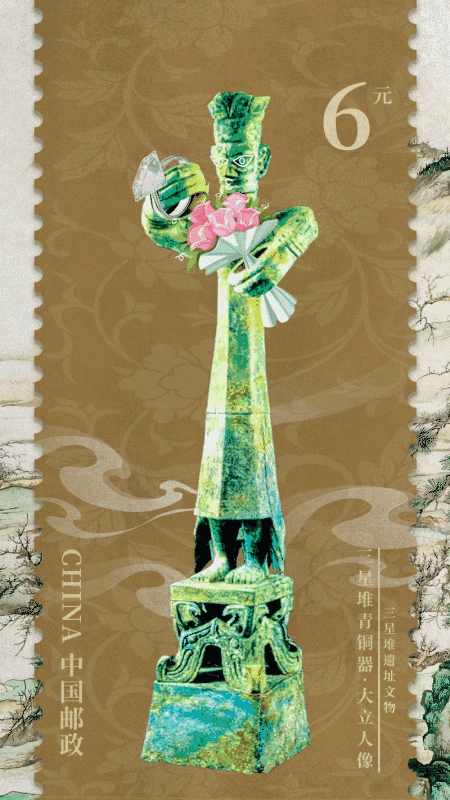 2012年9月26日,中国邮政发行《三星堆青铜器》特种邮票1套2枚、小型张1枚。其中邮票小型张展现三星堆青铜器中的大立人像。