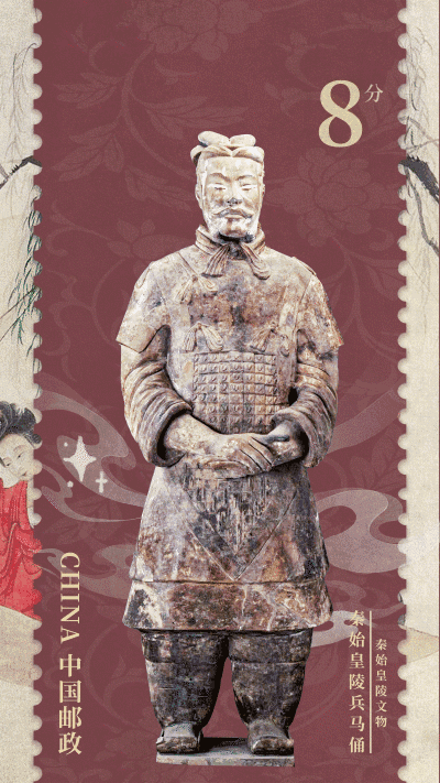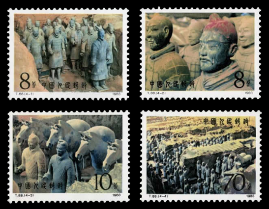 1983年6月30日,为了反映中华民族光辉灿烂的艺术创造,中华人民共和国邮电部发行一套《秦始皇陵兵马俑》特种邮票,全套4枚。这套邮票图案采用纪实性摄影形式,巧妙运用以点概面、点面结合的艺术手法,精心剪裁,从不同角度,在不同的光线下,既再现了秦始皇兵马俑坑的基本概貌,也捕捉住了兵马俑雕塑造型的艺术特征,形象生动,神态逼真,颇富艺术魅力。2019年这套邮票曾经被选入《中国》国礼邮折,作为国礼赠送给了英国女王。