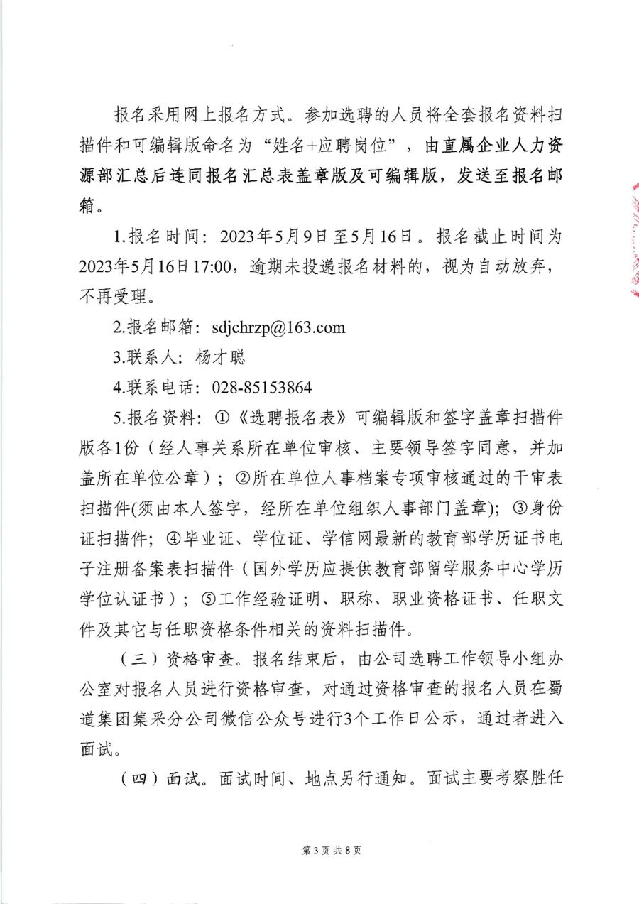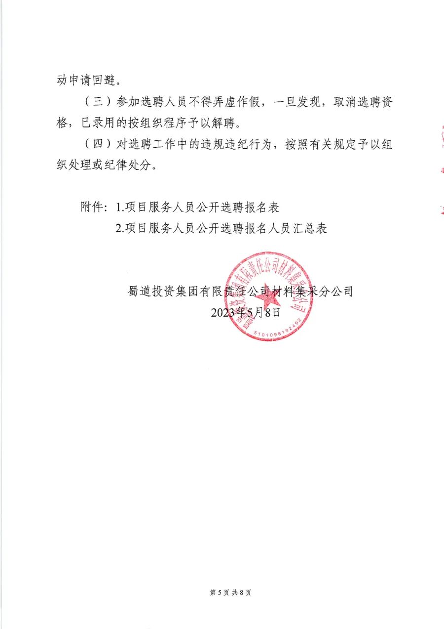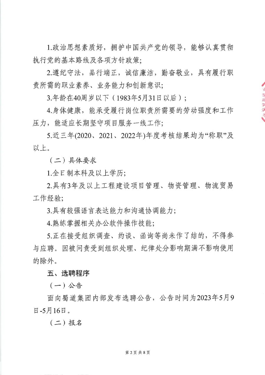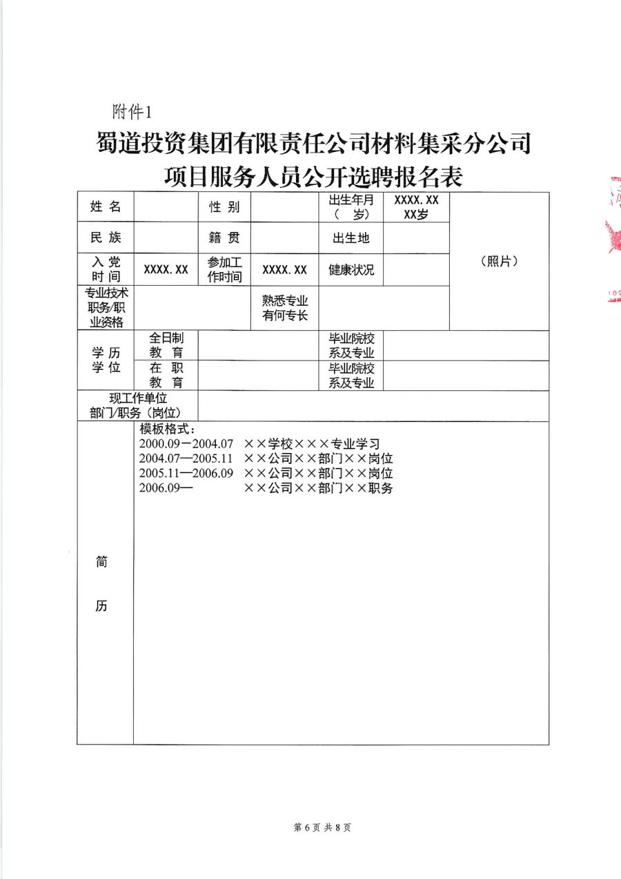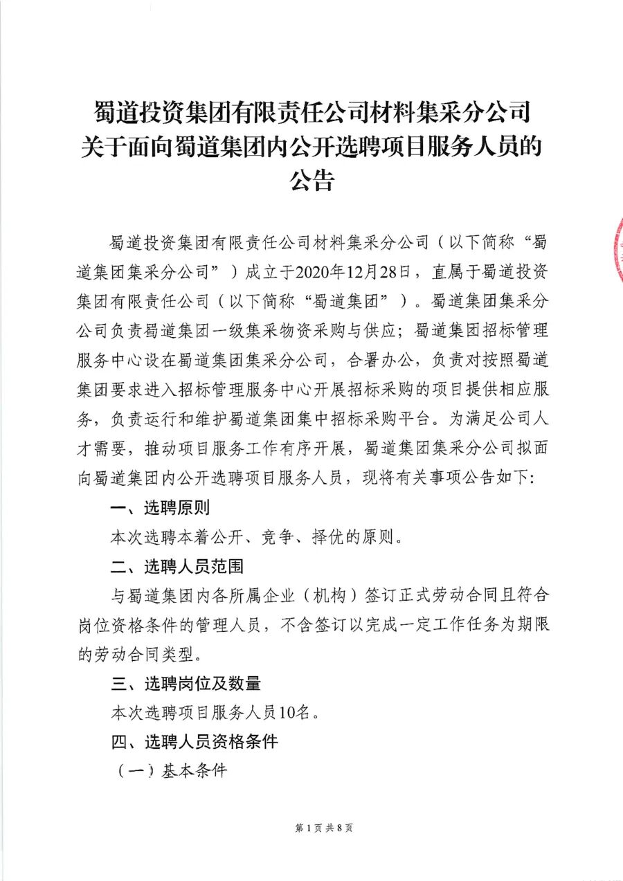 蜀道集团集采分公司关于面向蜀道集团内公开选聘项目服务人员的公告