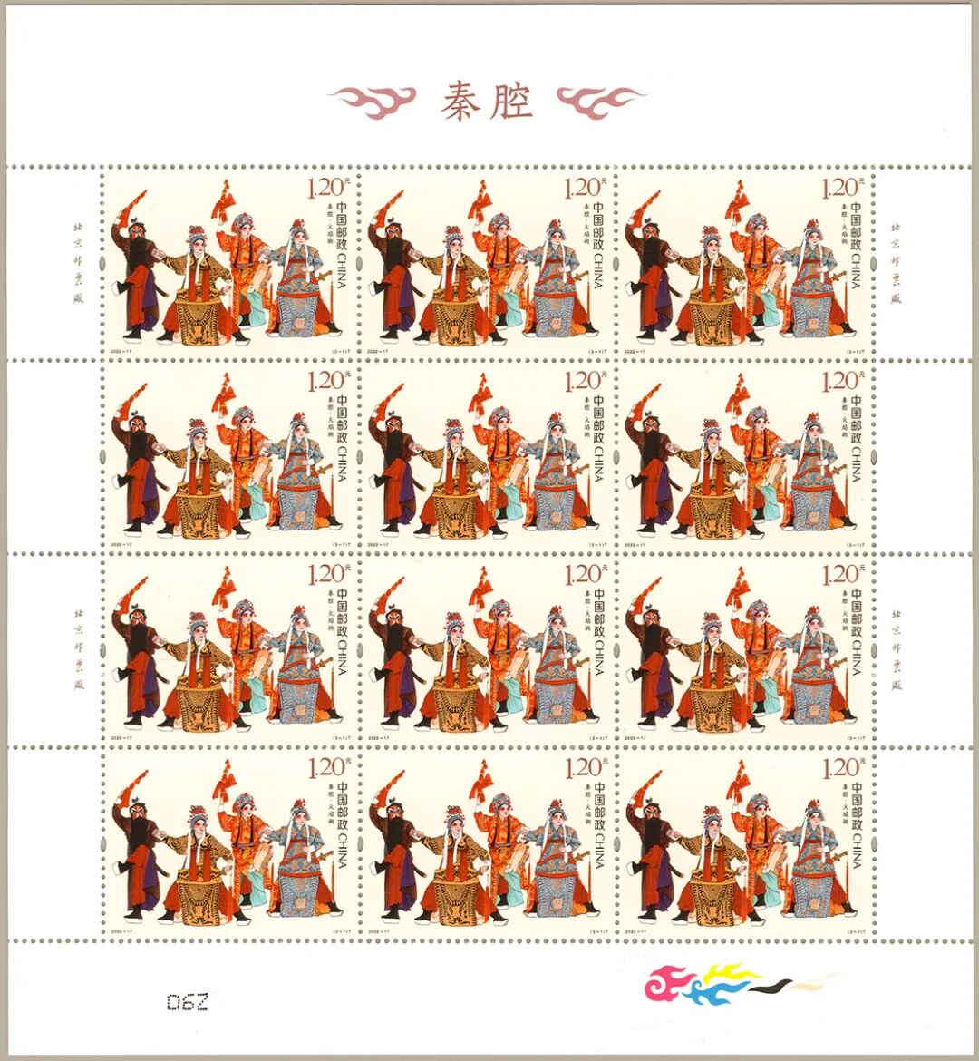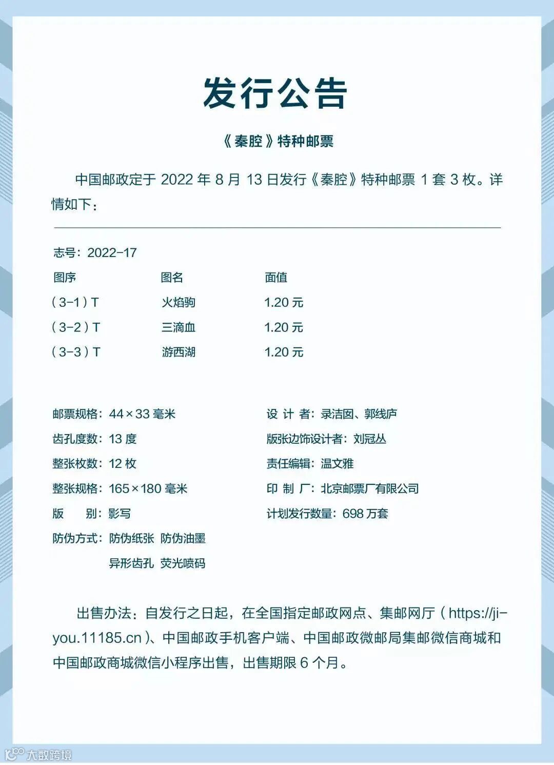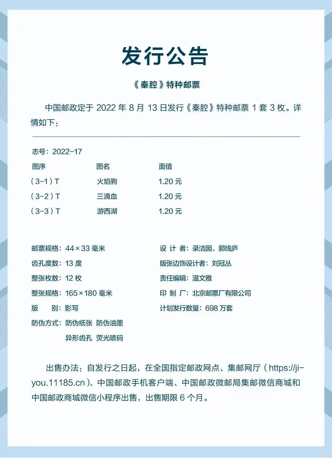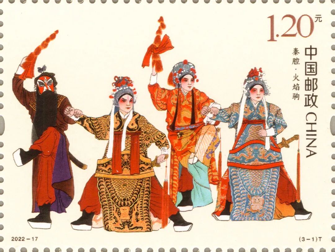 中国邮政定于8月13日发行《秦腔》特种邮票,一套3枚。邮票图案名称分别为:火焰驹、三滴血、游西湖。全套邮票面值为3.60元。邮票计划发行数量为698万套。