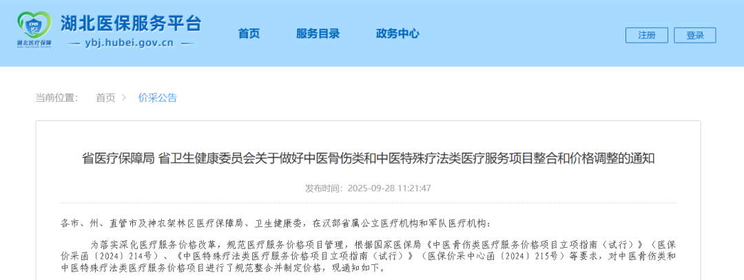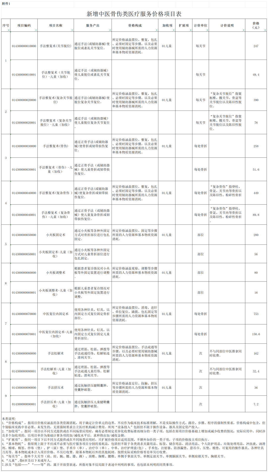 为落实深化医疗服务价格改革,规范医疗服务价格项目管理,根据国家医保局《中医骨伤类医疗服务价格项目立项指南(试行)》(医保价采函〔2024〕214号)、《中医特殊疗法类医疗服务价格项目立项指南(试行)》(医保价采中心函〔2024〕215号)等要求,对中医骨伤类和中医特殊疗法类医疗服务价格项目进行了规范整合并制定价格,现通知如下。