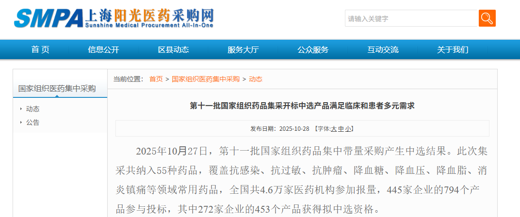 2025年10月27日,第十一批国家组织药品集中带量采购产生中选结果。此次集采共纳入55种药品,覆盖抗感染、抗过敏、抗肿瘤、降血糖、降血压、降血脂、消炎镇痛等领域常用药品,全国共4.6万家医药机构参加报量,445家企业的794个产品参与投标,其中272家企业的453个产品获得拟中选资格。