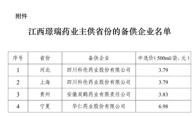 由江西璟瑞药业有限公司作为碳酸氢钠林格注射液主供企业的省份,应按照《全国药品集中采购文件(GY-YD2024-2)》相关条款启动替补程序,由备供企业替补成为主供企业,并按本企业中选价格供应;当新确认的主供企业不能满足供应需求时,由所在省份启动增补备供企业流程。