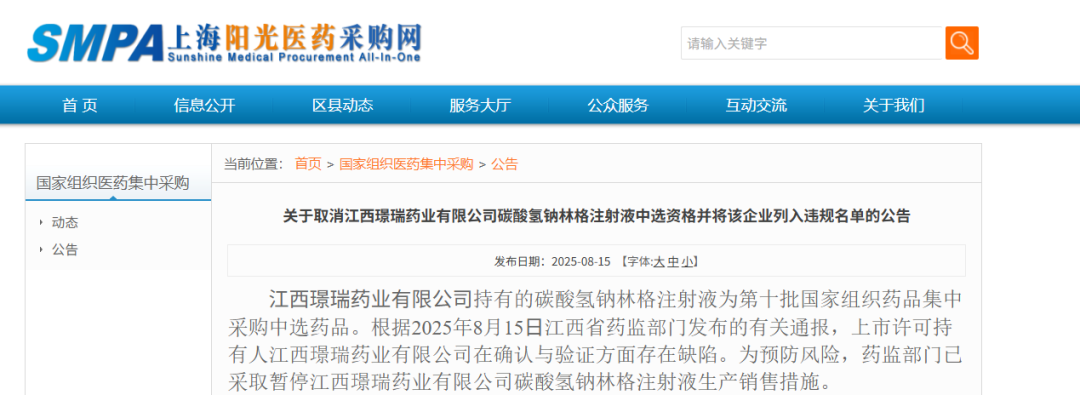 按照《国务院办公厅关于推动药品集中带量采购工作常态化制度化开展的意见》(国办发〔2021〕2号)精神,经国家组织药品联合采购办公室相关成员单位集体审议,江西璟瑞药业有限公司违背在申报材料中作出的承诺,违反《全国药品集中采购文件(GY-YD2024-2)》有关条款。联合采购办公室决定取消江西璟瑞药业有限公司碳酸氢钠林格注射液中选资格,同时将江西璟瑞药业有限公司列入“违规名单”,暂停该企业自2025年8月15日至2027年2月14日参与国家组织药品集中采购活动的申报资格。