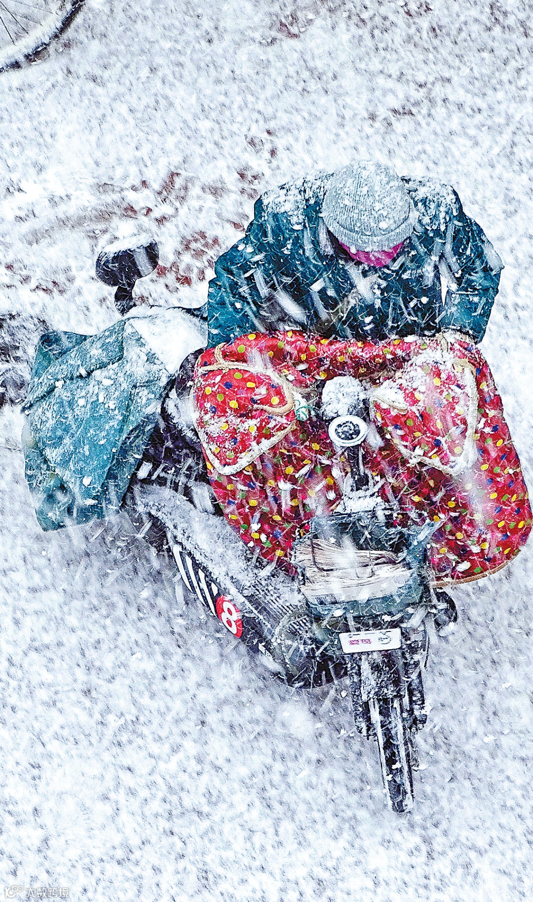 中国邮政集团有限公司天大邮电支局邮递员冒雪为订户送报纸。冯平摄(人民视觉)