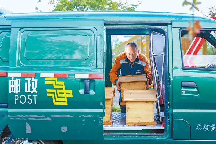 在浙江省湖州市长兴县,林城镇邮政所蜂产业专职投递员王国庆把要寄递的蜂箱搬上快递车。许斌华摄(影像中国)