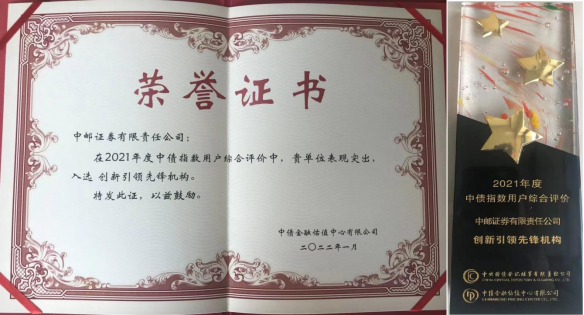 近日,中债金融估值中心有限公司(以下简称“中债估值中心”)公布2021年度中债指数用户综合评价结果,中邮证券有限责任公司凭借在指数投资创新方面的突出表现,获评2021年度中债指数用户综合评价“创新引领先锋机构”荣誉称号。