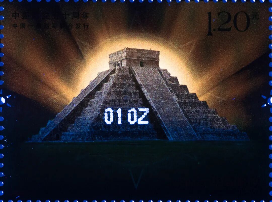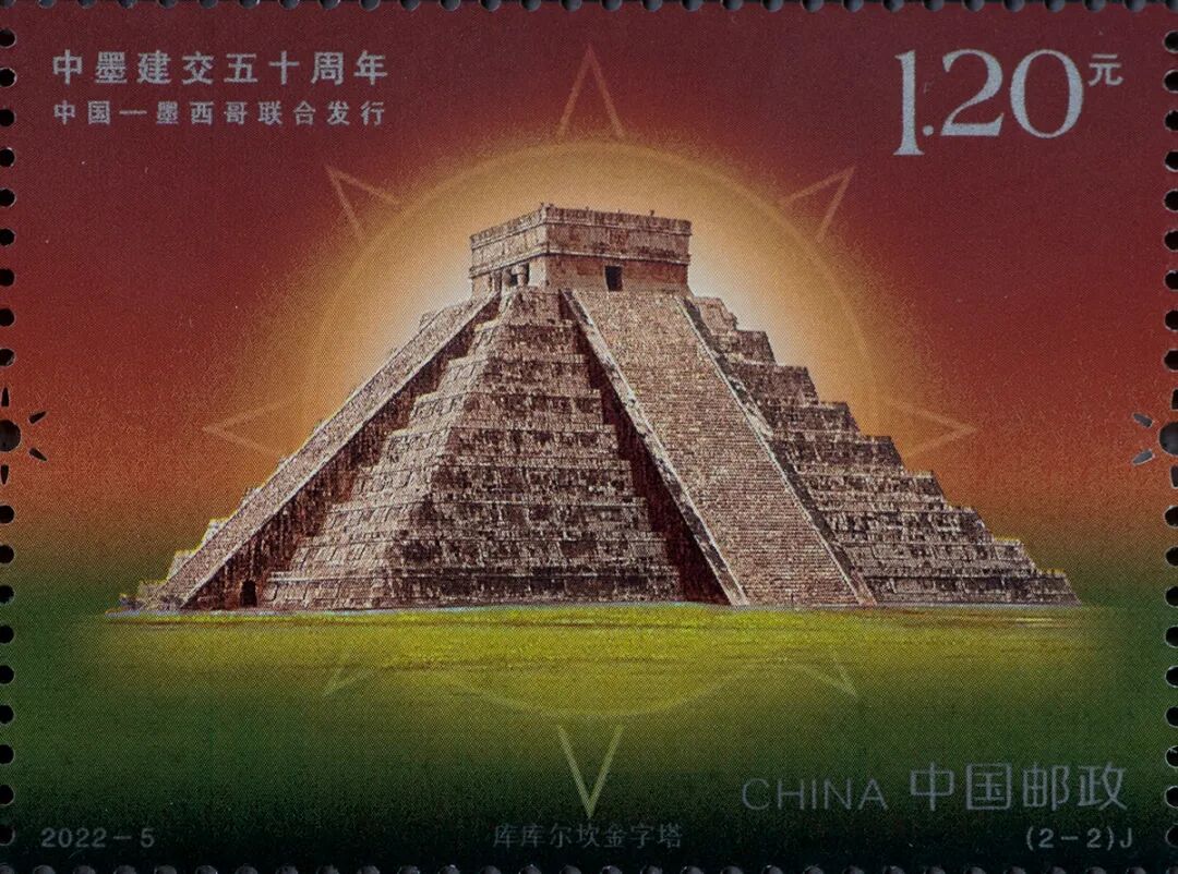 2022年是中华人民共和国与墨西哥合众国建交50周年,中国邮政定于2022年2月14日发行《中墨建交五十周年》纪念邮票一套2枚,邮票图案名称分别为观星台、库库尔坎金字塔。全套邮票面值2.40元。邮票计划发行数量为670万套。