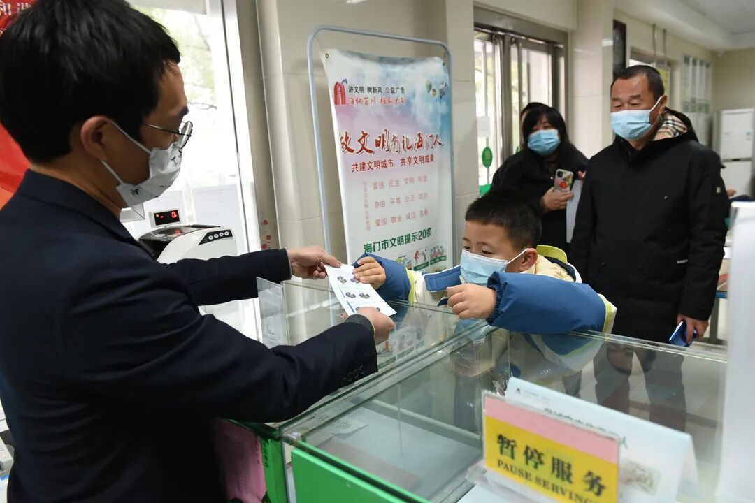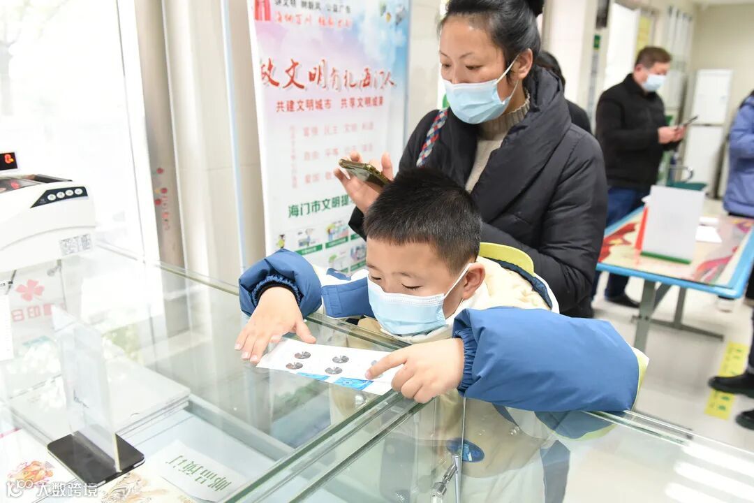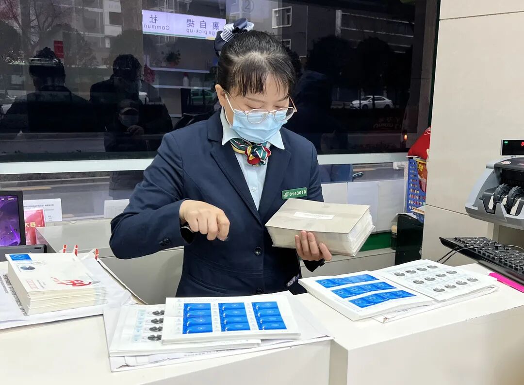 2月5日,在南通市海门区邮政分公司解放路支局,现场工作人员在上午8点开始拆封销售冬奥会纪念邮票。