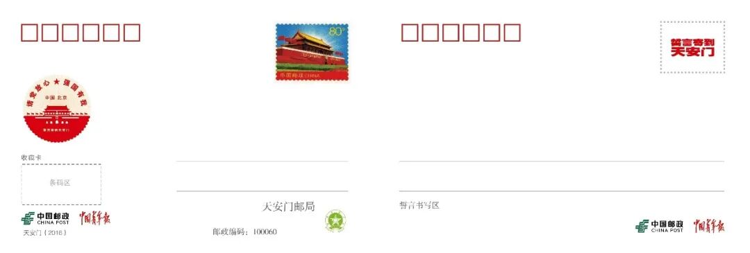 2022年5月5日前,天安门邮局收到誓言明信片后,将会在收藏联加盖2022年5月5日天安门风景日戳寄回誓言填写人,留作收藏。