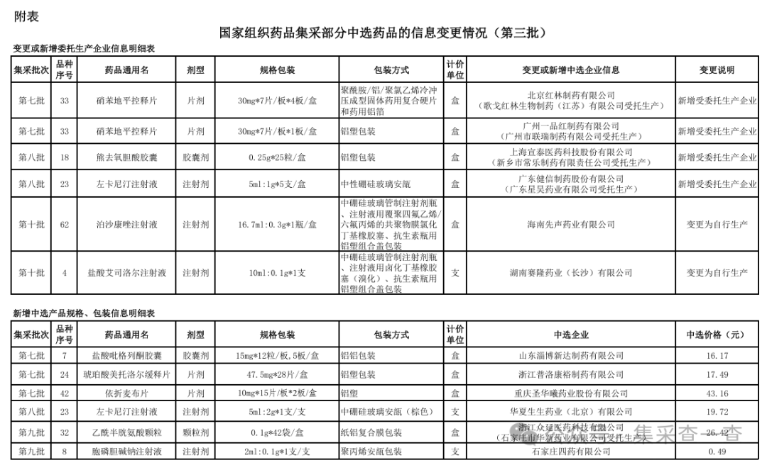 附表:国家组织药品集采部分中选药品的信息变更情况(第三批)