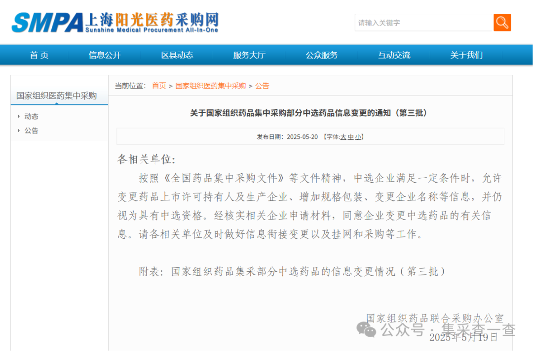 按照《全国药品集中采购文件》等文件精神,中选企业满足一定条件时,允许变更药品上市许可持有人及生产企业、增加规格包装、变更企业名称等信息,并仍视为具有中选资格。经核实相关企业申请材料,同意企业变更中选药品的有关信息。请各相关单位及时做好信息衔接变更以及挂网和采购等工作。