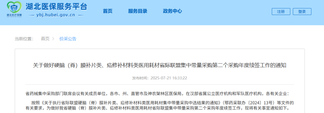 关于做好硬脑(脊)膜补片类、疝修补材料类医用耗材省际联盟集中带量采购第二个采购年度续签工作的通知
