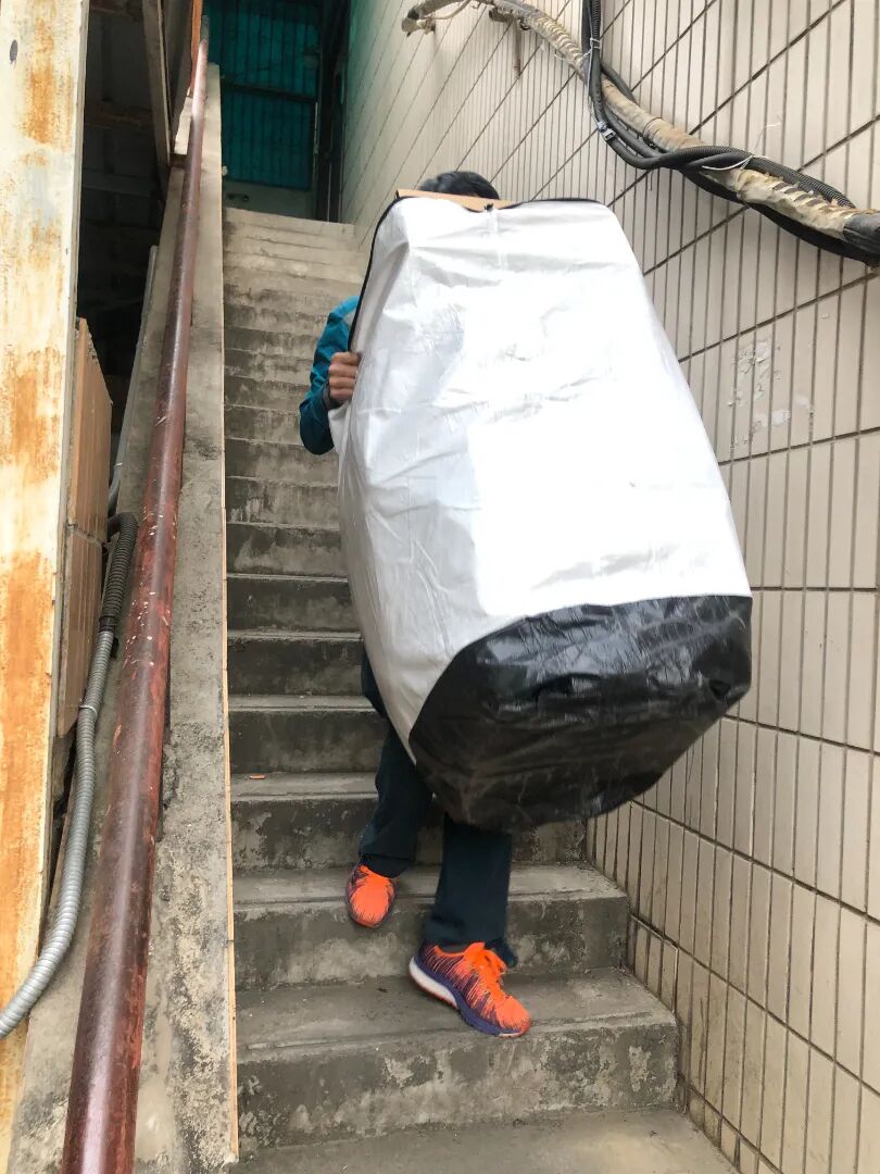 面对用户“双11”购买的大件或者多件快递,邮政小哥变身力大无穷的“钢铁人”,爬上爬下,为用户提供上门服务。