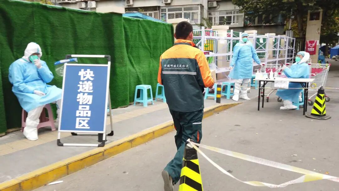在疫情封控管理地区,邮政小哥勇敢逆行,在符合疫情防控规定的前提下,第一时间将用户的“双11”邮件投递到位。