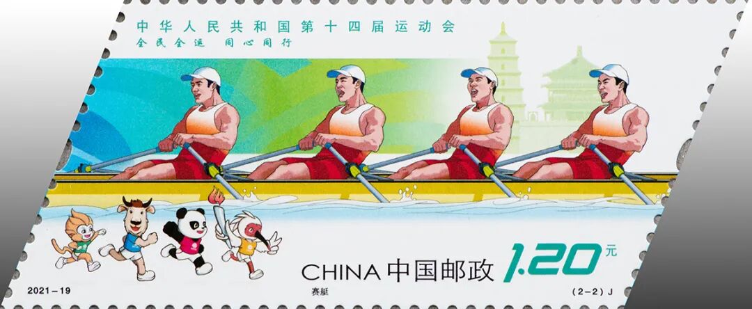 邮票内容为射击、赛艇。画面以蓝、绿色为主色调,运用平行四边形票幅结合连票设计形式表现,增强了画面的动感,画面同时表现了会徽、吉祥物、场馆以及大雁塔、西安钟楼等元素,突出了举办地特色。
