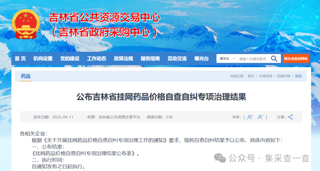 公布吉林省挂网药品价格自查自纠专项治理结果