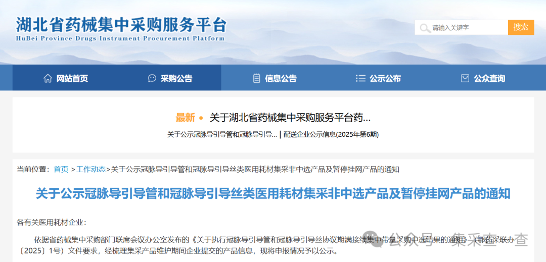依据省药械集中采购部门联席会议办公室发布的《关于执行冠脉导引导管和冠脉导引导丝协议期满接续集中带量采购中选结果的通知》(鄂药采联办〔2025〕1号)文件要求,经梳理集采产品维护期间企业提交的产品信息,现将申报情况予以公示。