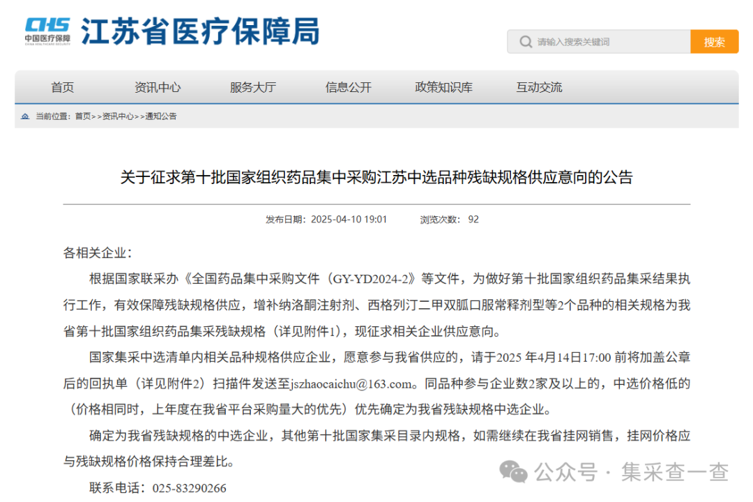 关于征求第十批国家组织药品集中采购江苏中选品种残缺规格供应意向的公告