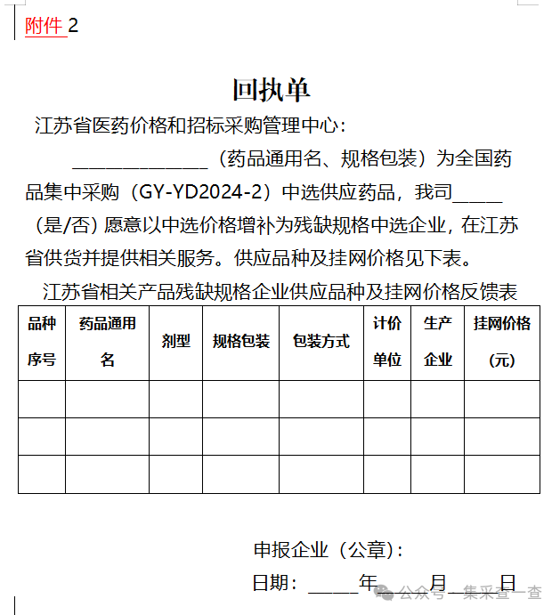 国家集采中选清单内相关品种规格供应企业,愿意参与我省供应的,请于2025 年4月14日17:00 前将加盖公章后的回执单(详见附件2)扫描件发送至jszhaocaichu@163.com。同品种参与企业数2家及以上的,中选价格低的(价格相同时,上年度在我省平台采购量大的优先)优先确定为我省残缺规格中选企业。