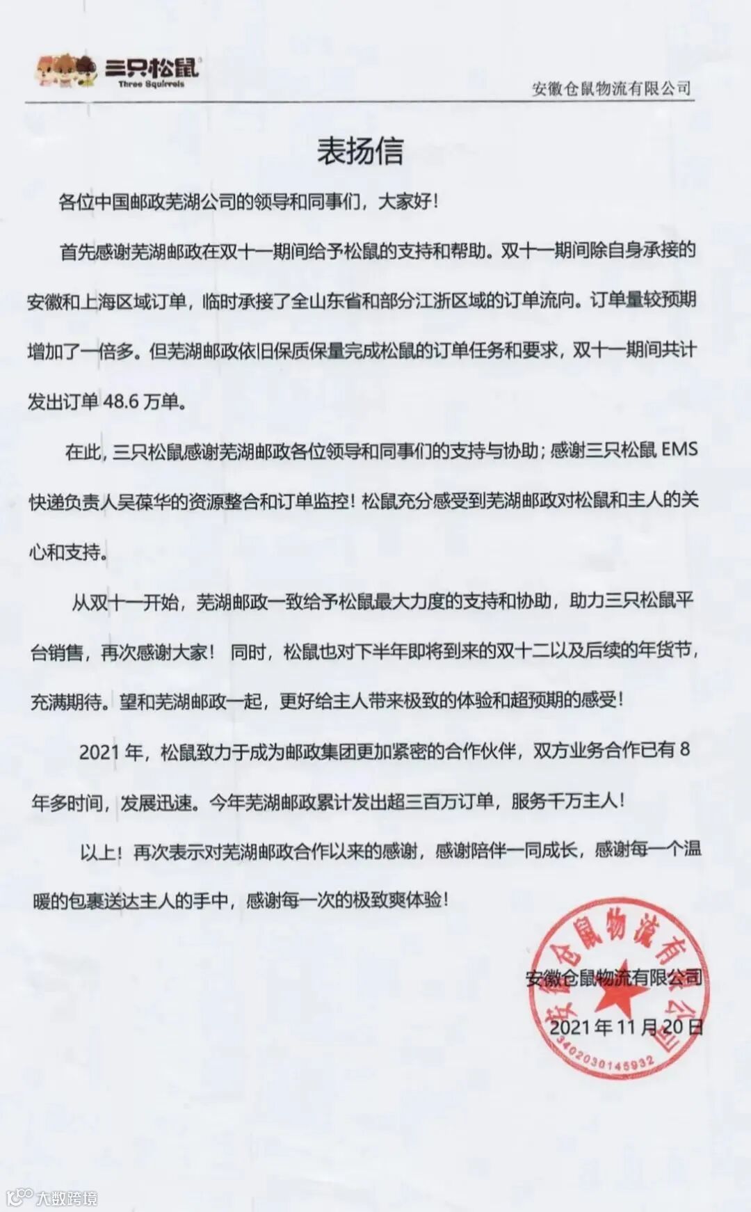 为三只松鼠提供了大力支持