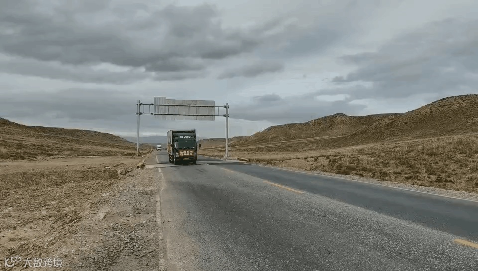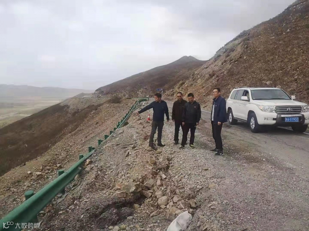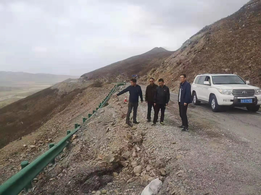 青海省分公司应急救援工作组火速开赴玛多县震区,图为途经海拔3893米的河卡山垭口,察看邮路受损情况