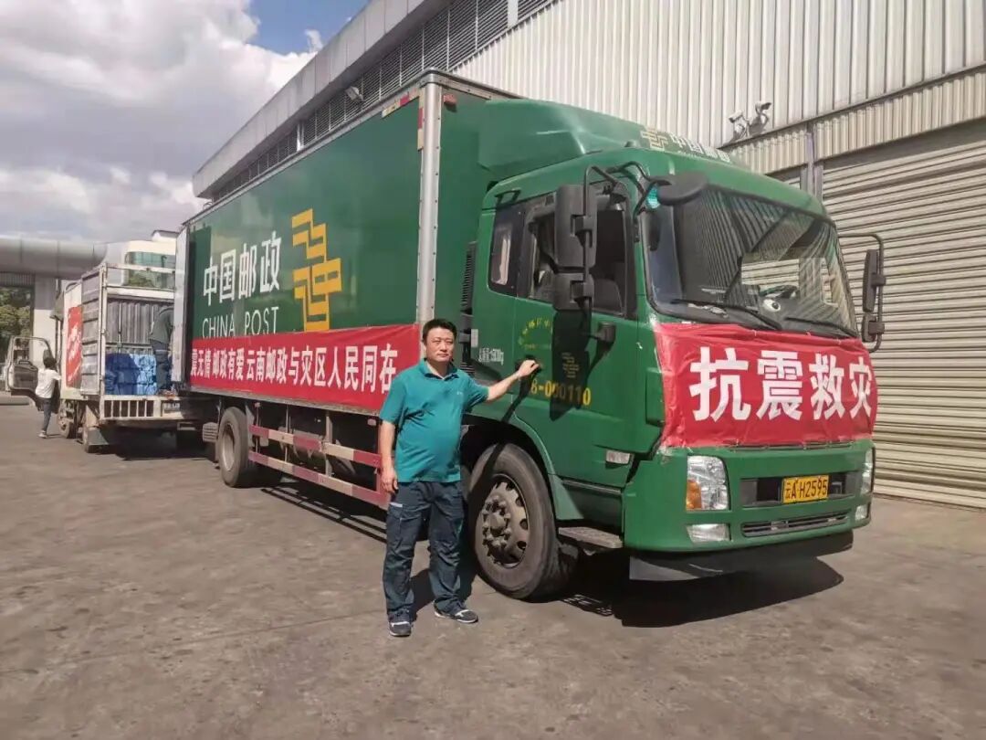装着70顶救灾帐篷、70台应急照明灯、70块防潮地垫的救灾物资车辆,从昆明邮区中心局开出