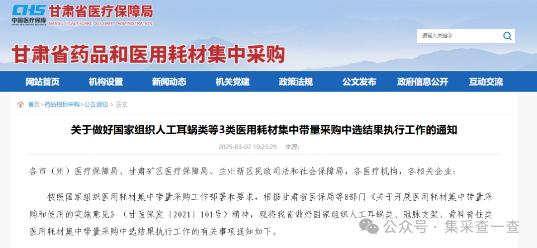 (一)执行时间。2025年3月31日起我省开始执行人工耳蜗类集采中选结果、冠脉支架接续采购第三年协议期及骨科脊柱类集采第二年协议期。