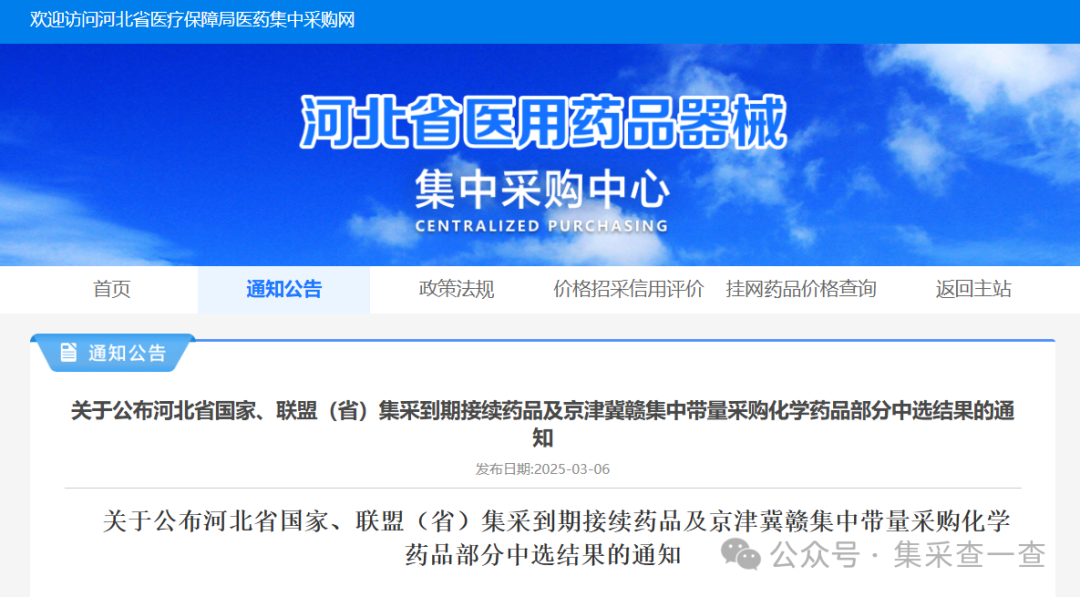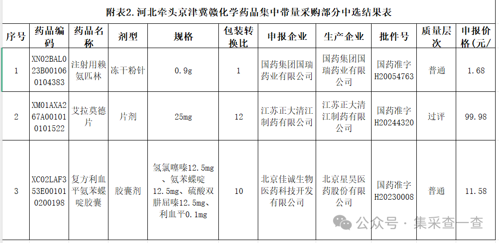 关于公布河北省国家、联盟(省)集采到期接续药品及京津冀赣集中带量采购化学药品部分中选结果的通知