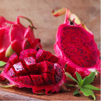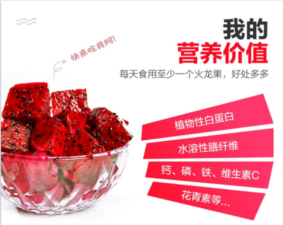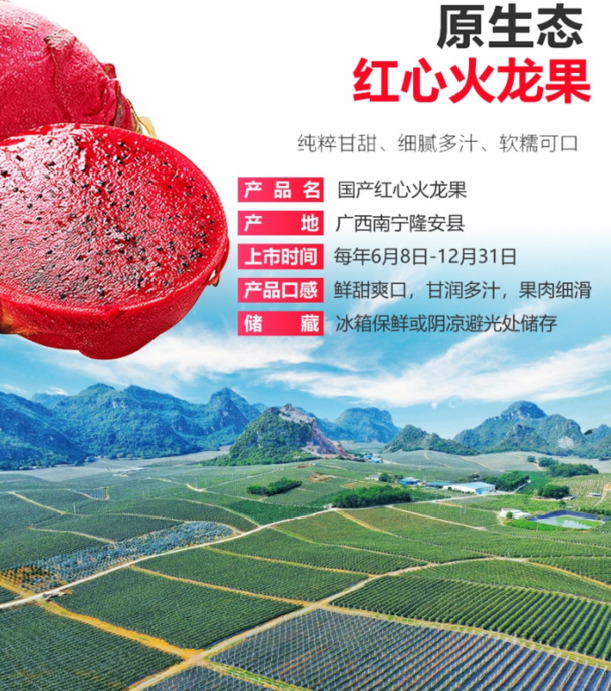隆安红心火龙果外形娇艳,皮薄肉厚,容易剥皮,果肉呈现玫瑰红色,细腻绵密,汁水丰盈,入口即化。包裹着红彤彤的果肉,镶嵌芝麻般的细小籽粒,而且金都一号火龙果含有一般植物少有的植物性蛋白和丰富的花青素、维生素等。